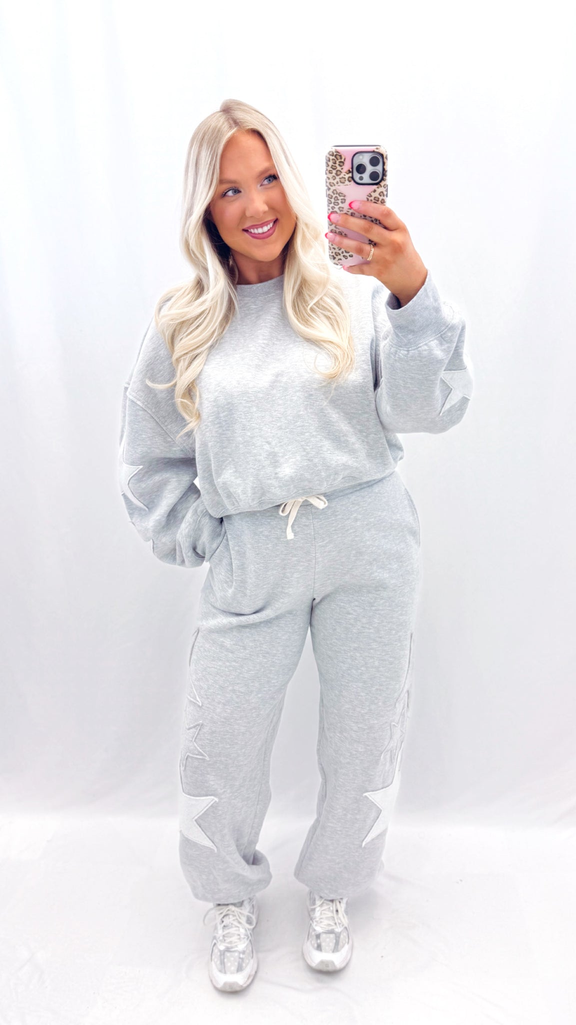 Sarah is 5'6 (8.5 mo pregnant) currently a size large in tops, a size 12 in jeans wearing a size large. Sweatpants with applique stars on legs. Has pockets.