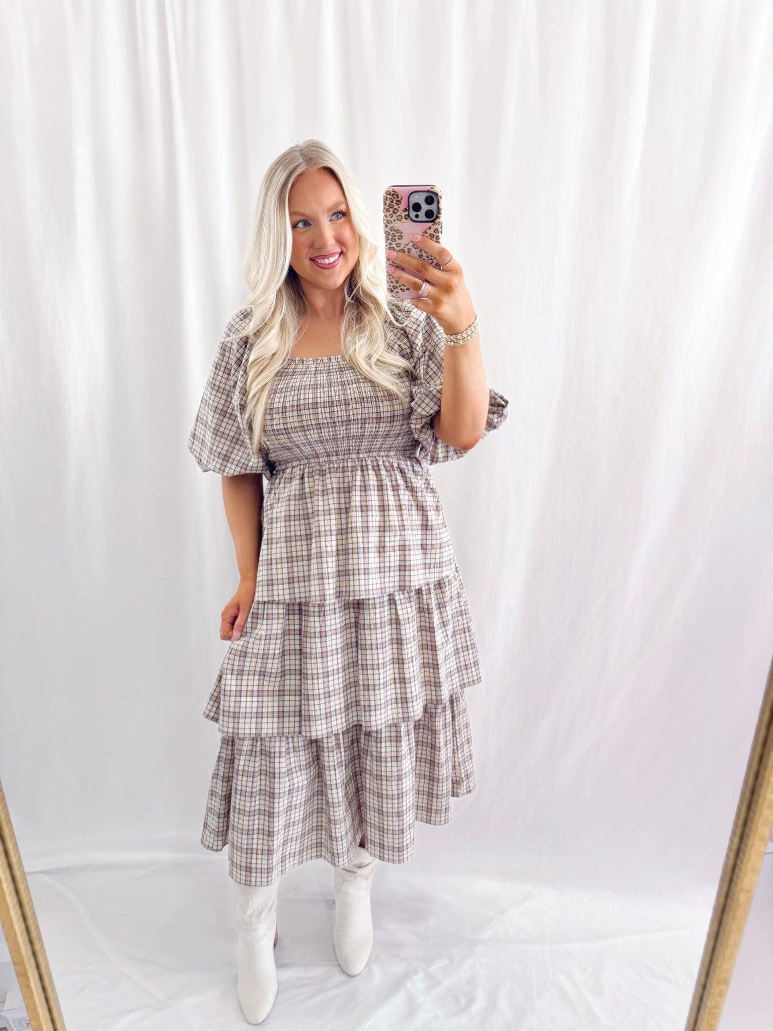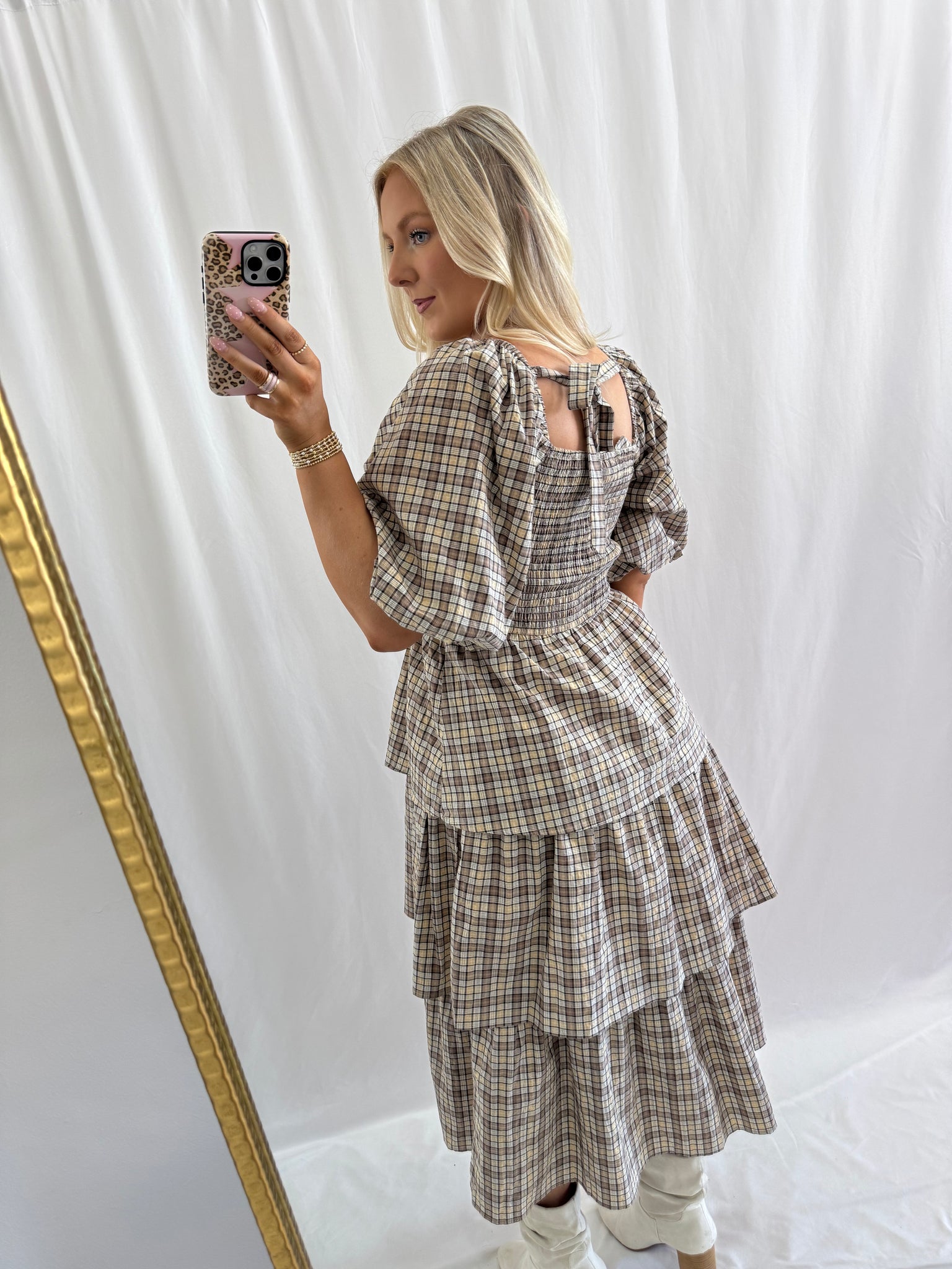 Sarah is 5'6, 6 months pregnant, currently a US size 8/10 pictured in a size medium. Smocked stretchy elastic bust. Skirt is tiered. Tie at the top of the back of shoulders.