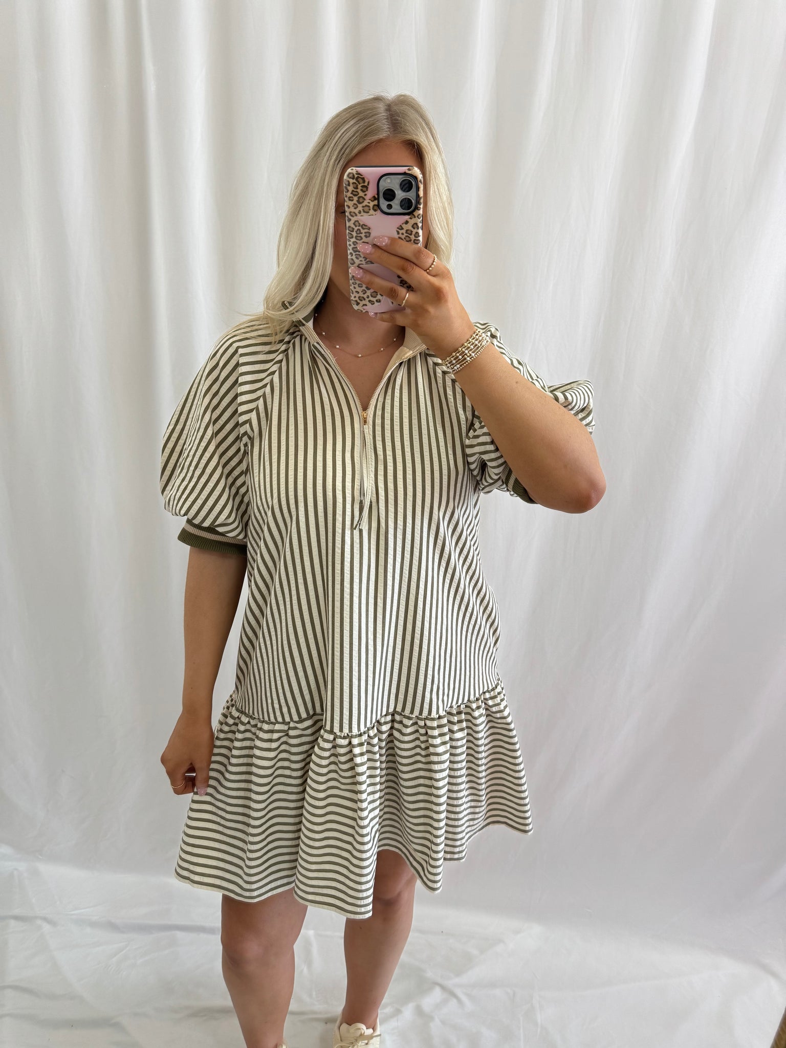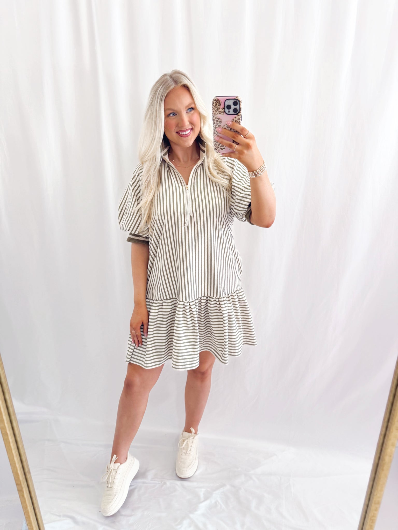 Sarah is 5'6, 6 months pregnant, currently a US size 8/10 pictured in a size large. Striped accent band and gold zipper neckline. Has pockets