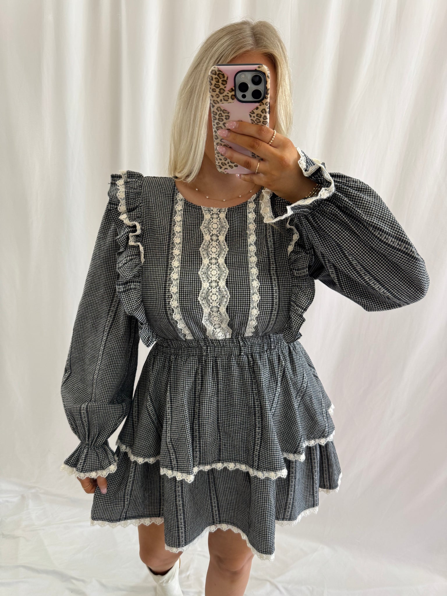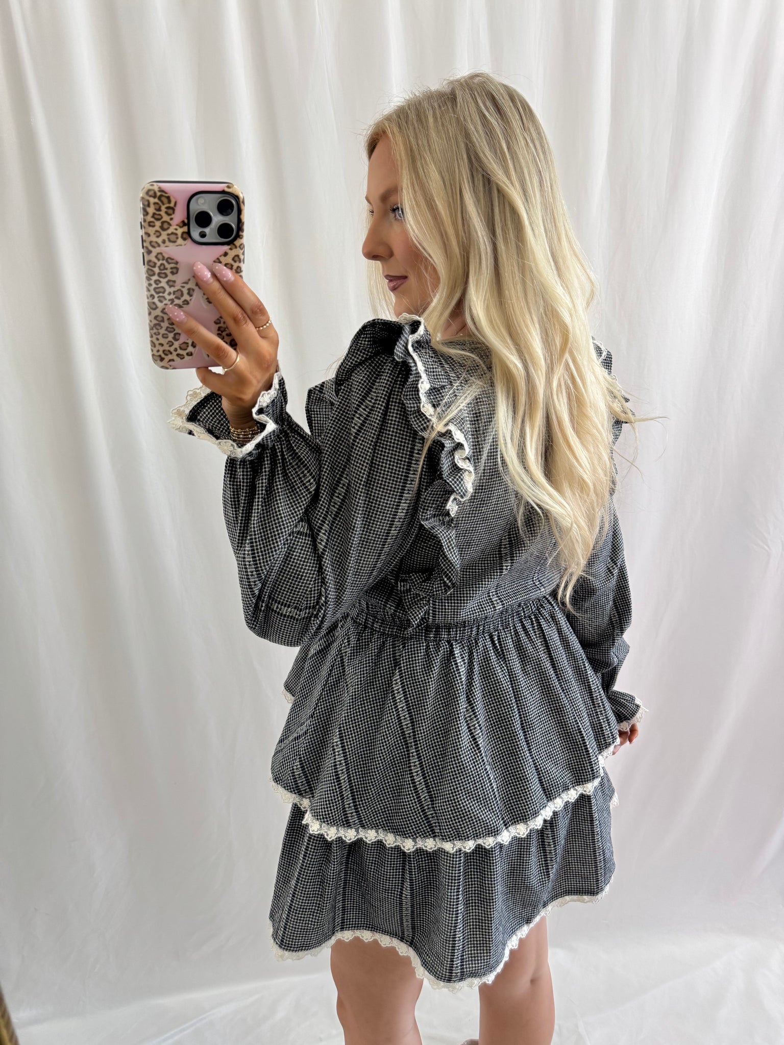 Sarah is 5'6, 6 months pregnant, currently a US size 8/10 pictured in a size large. Elastic waist. Ruffle and lace detail. Tiered skirt.