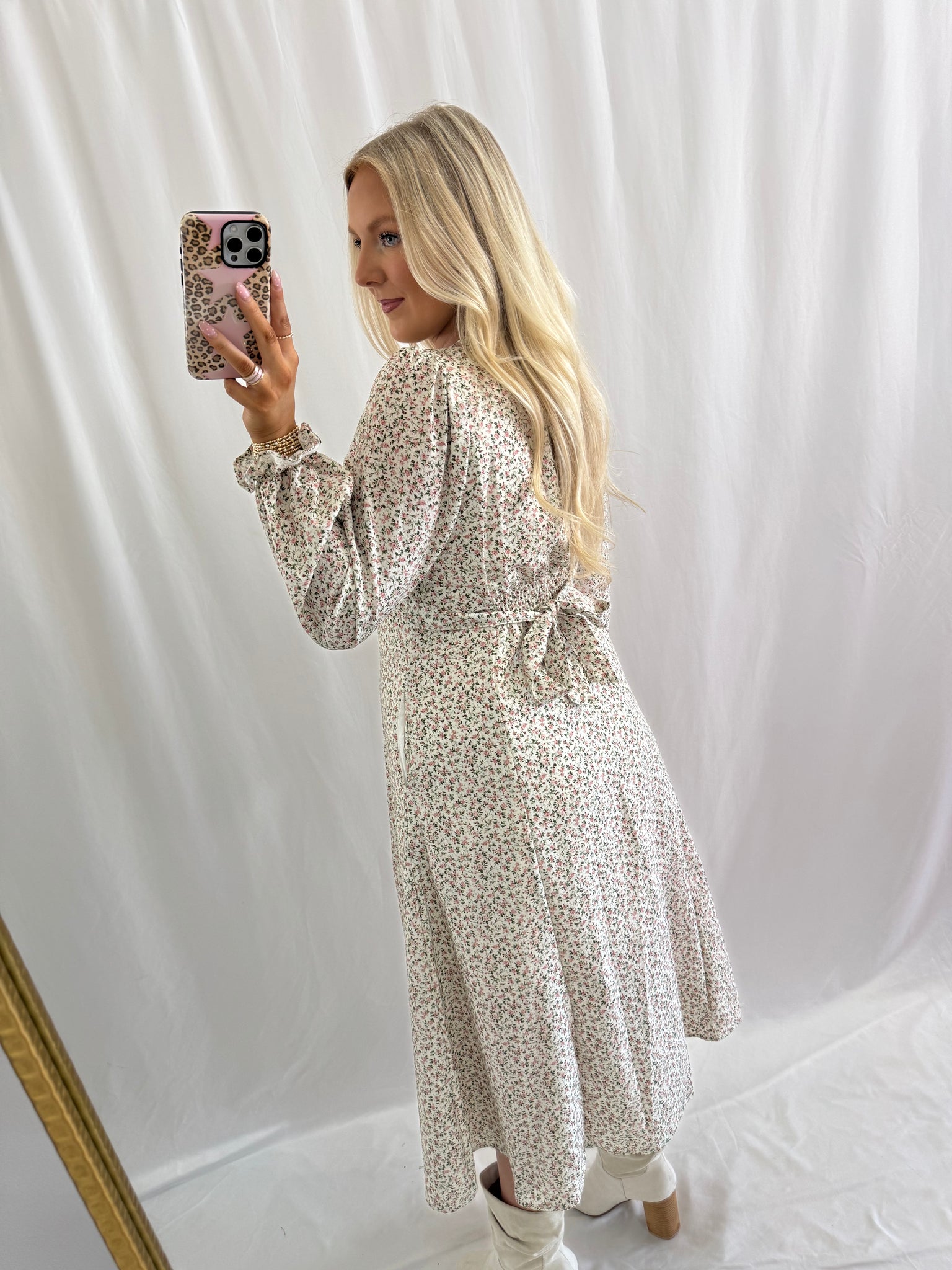 Sarah is 5'6, 6 months pregnant, currently a US size 8/10 pictured in a size large. Front middle button detail. Smocked elastic stretch band on the back half of the waist. Fully lined. Lace neckline detail. Optional back OR front tie