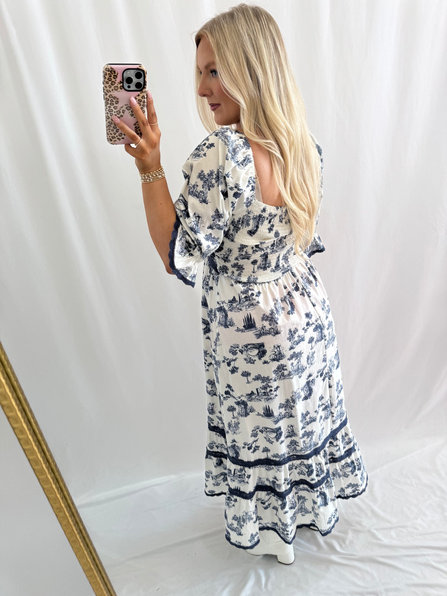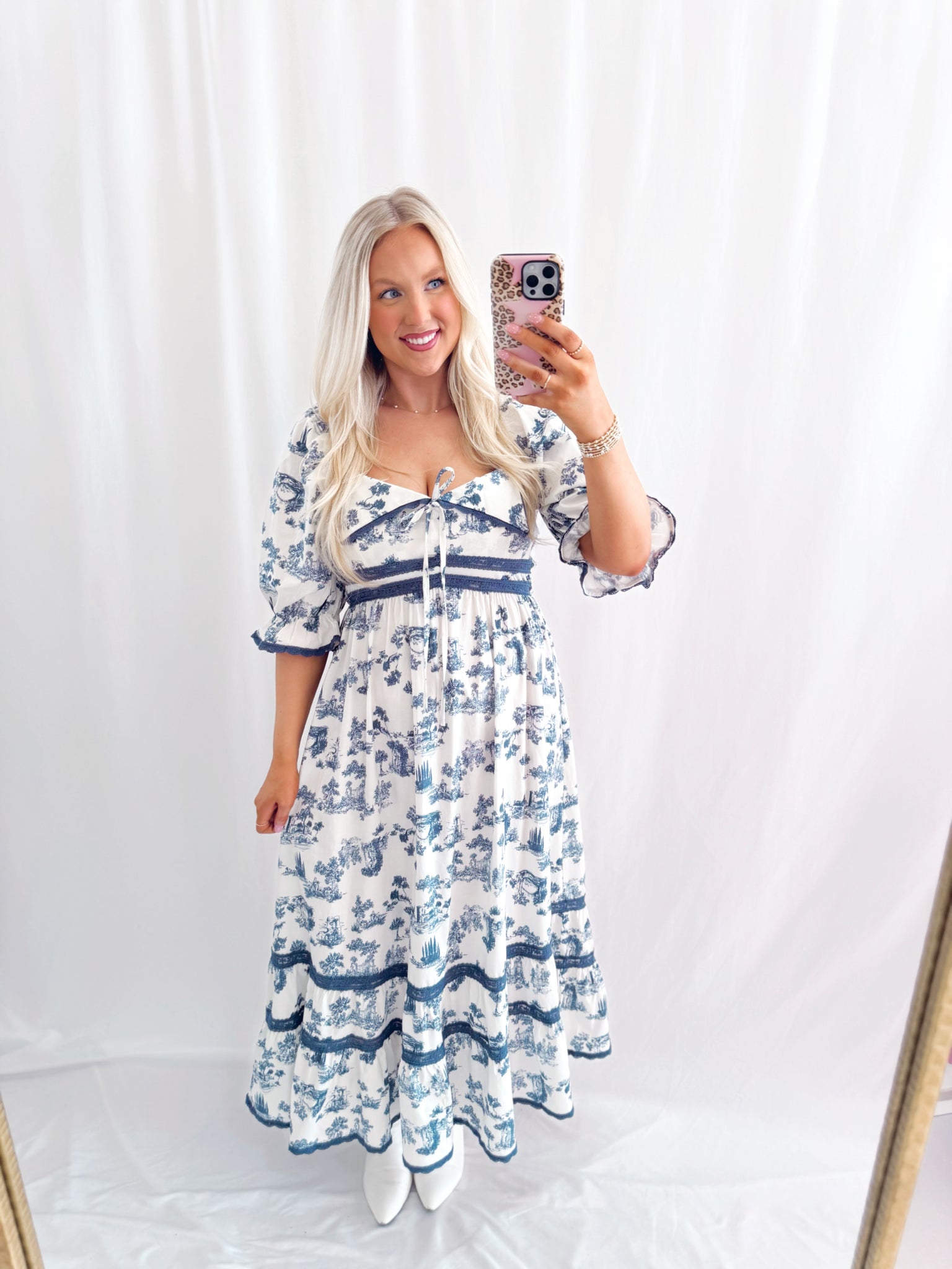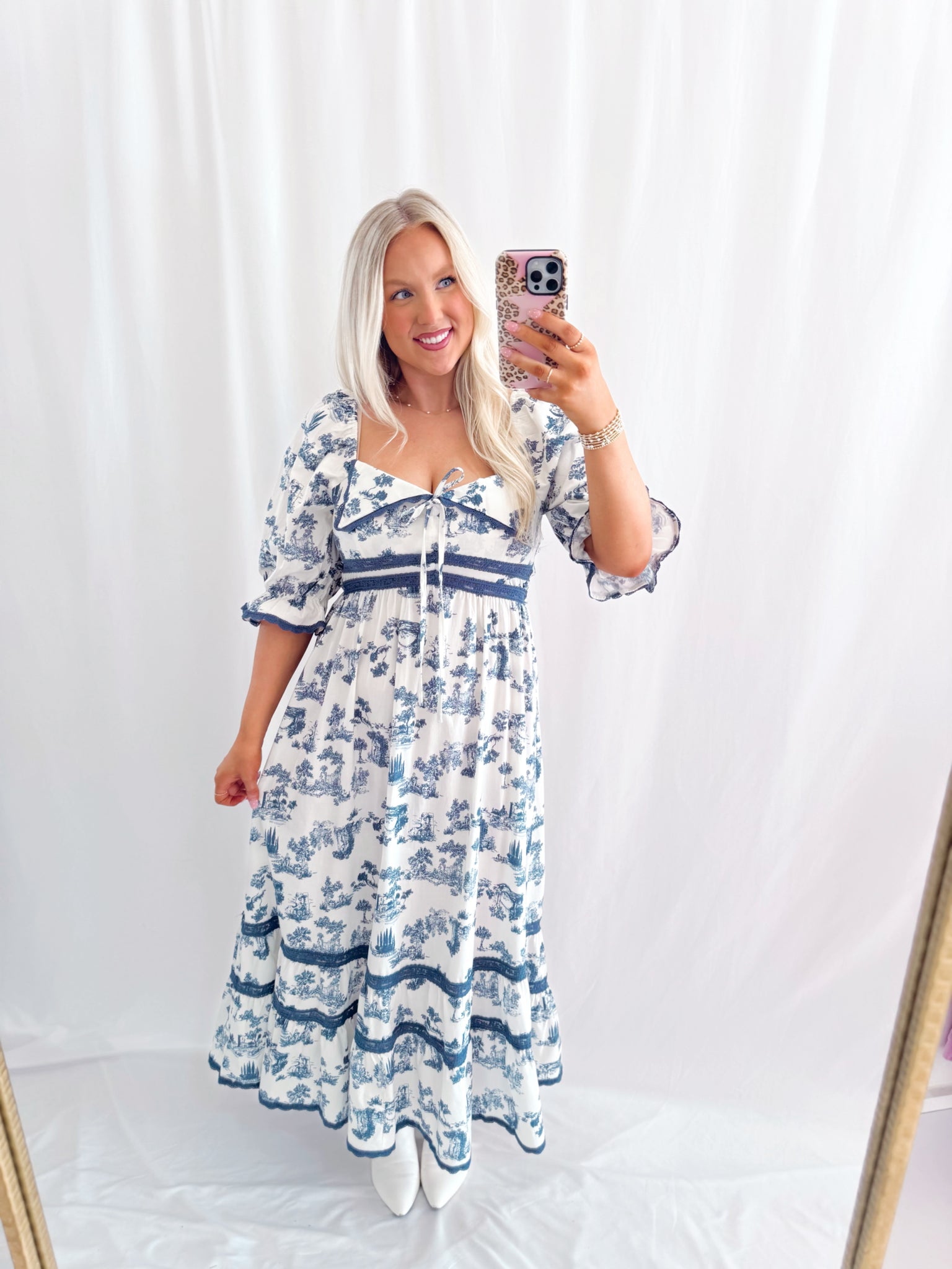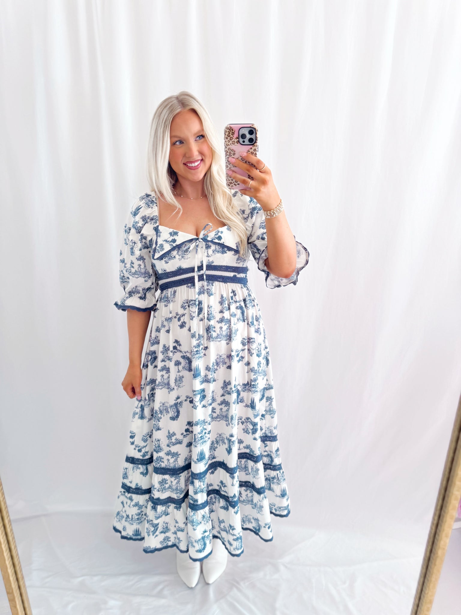 Sarah is 5'6, 6 months pregnant, currently a US size 8/10 pictured in a size large. Stretchy smocked back of bust. Lace detail.
