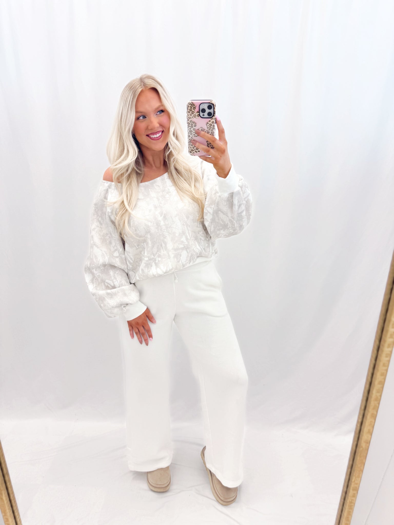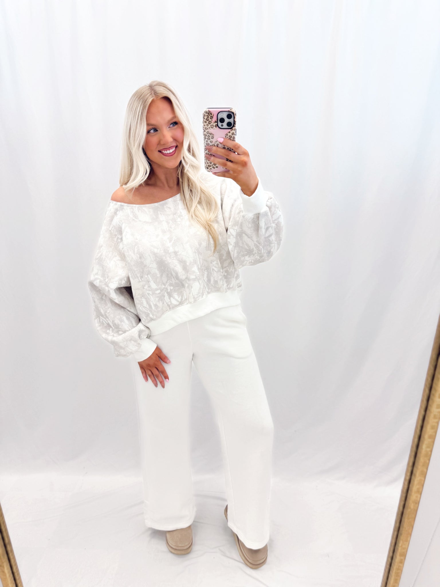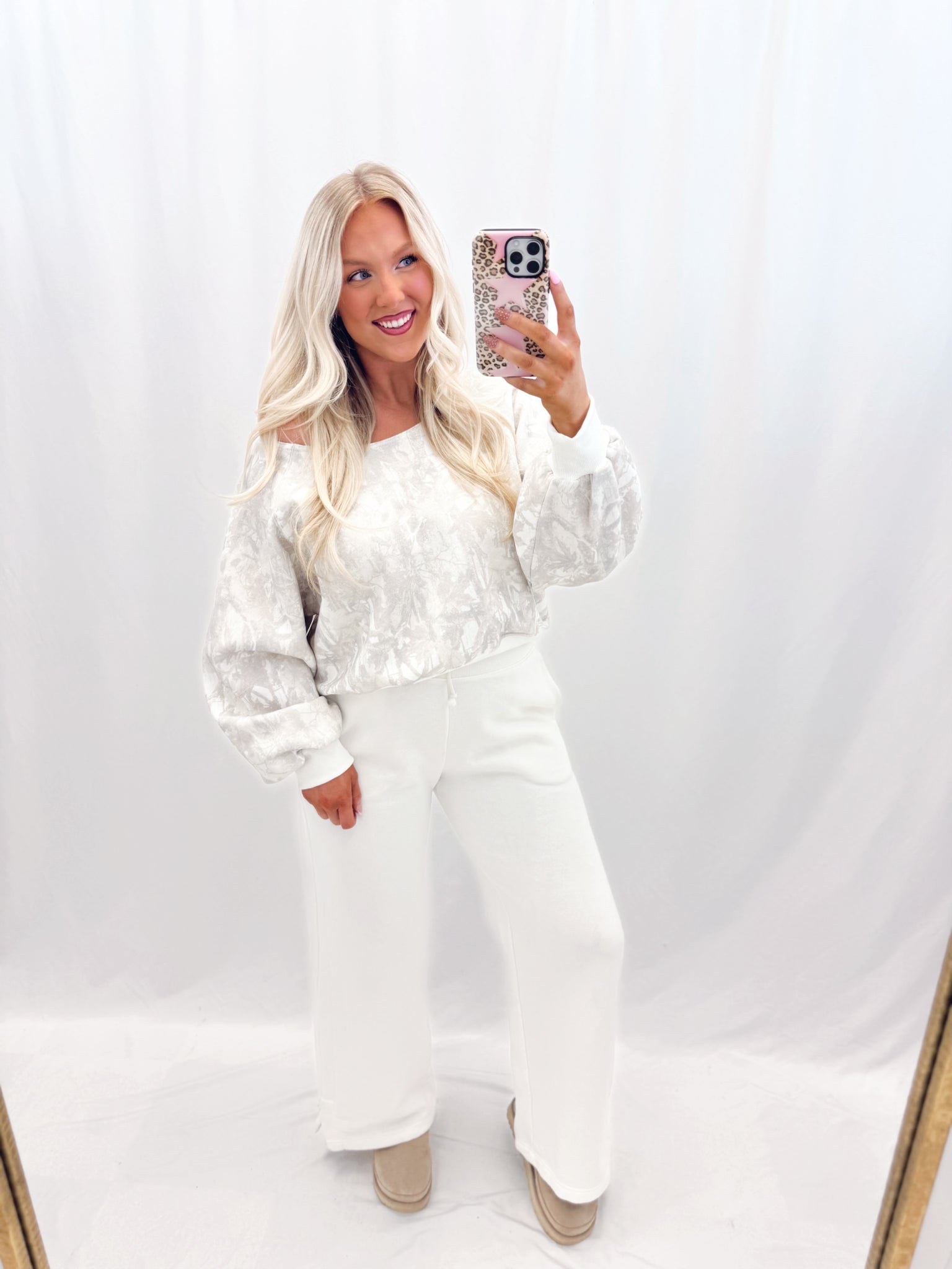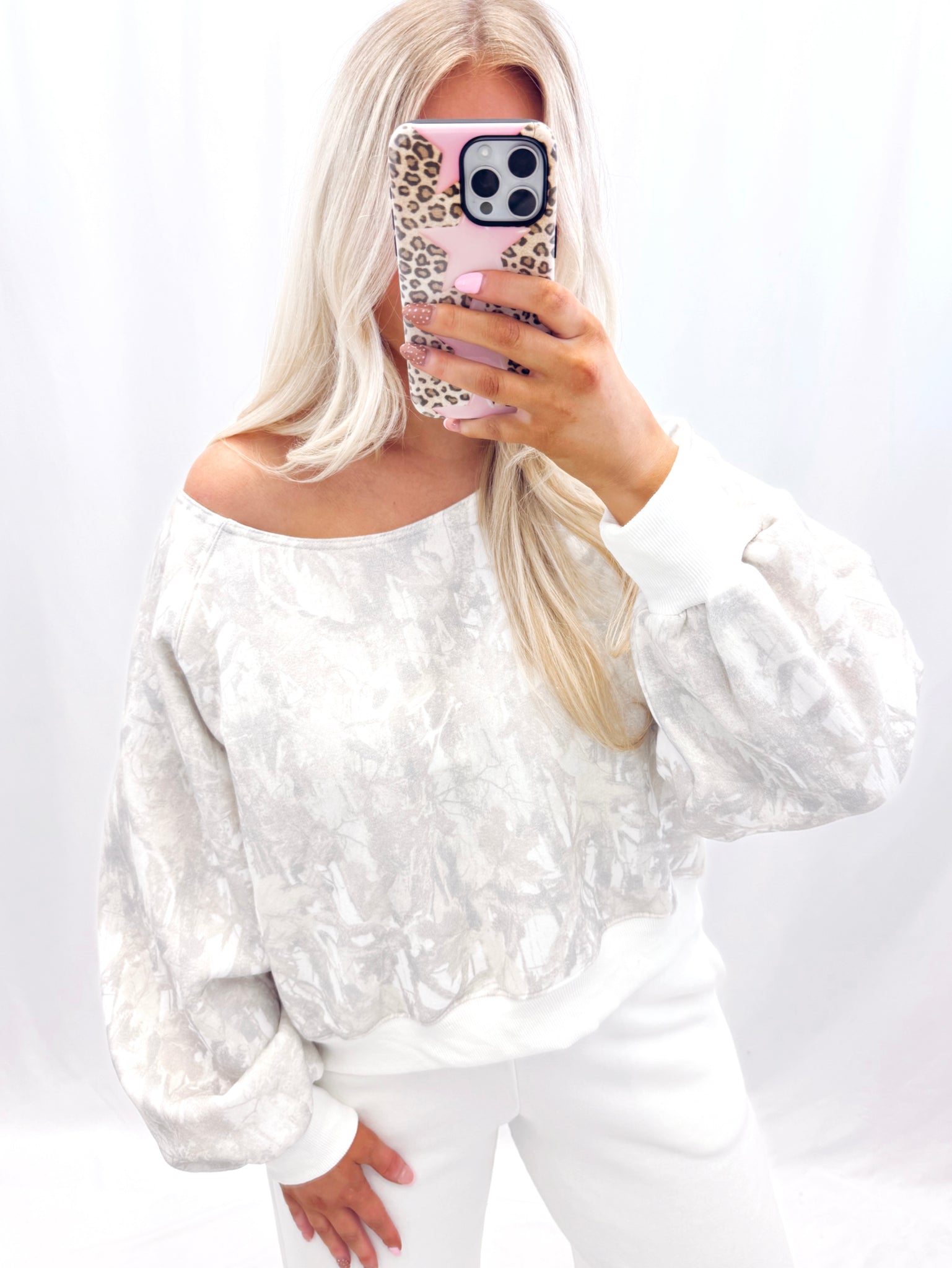 Sarah is 5'6 (7 mo pregnant) currently a size large in tops, a size 10/12 in jeans wearing a size large. Fit is relaxed. Slouchy (can be one shoulder or boatneck). More of a cropped fit. Fleece lined hoodie with balloon sleeves. Heavier weight great quality.