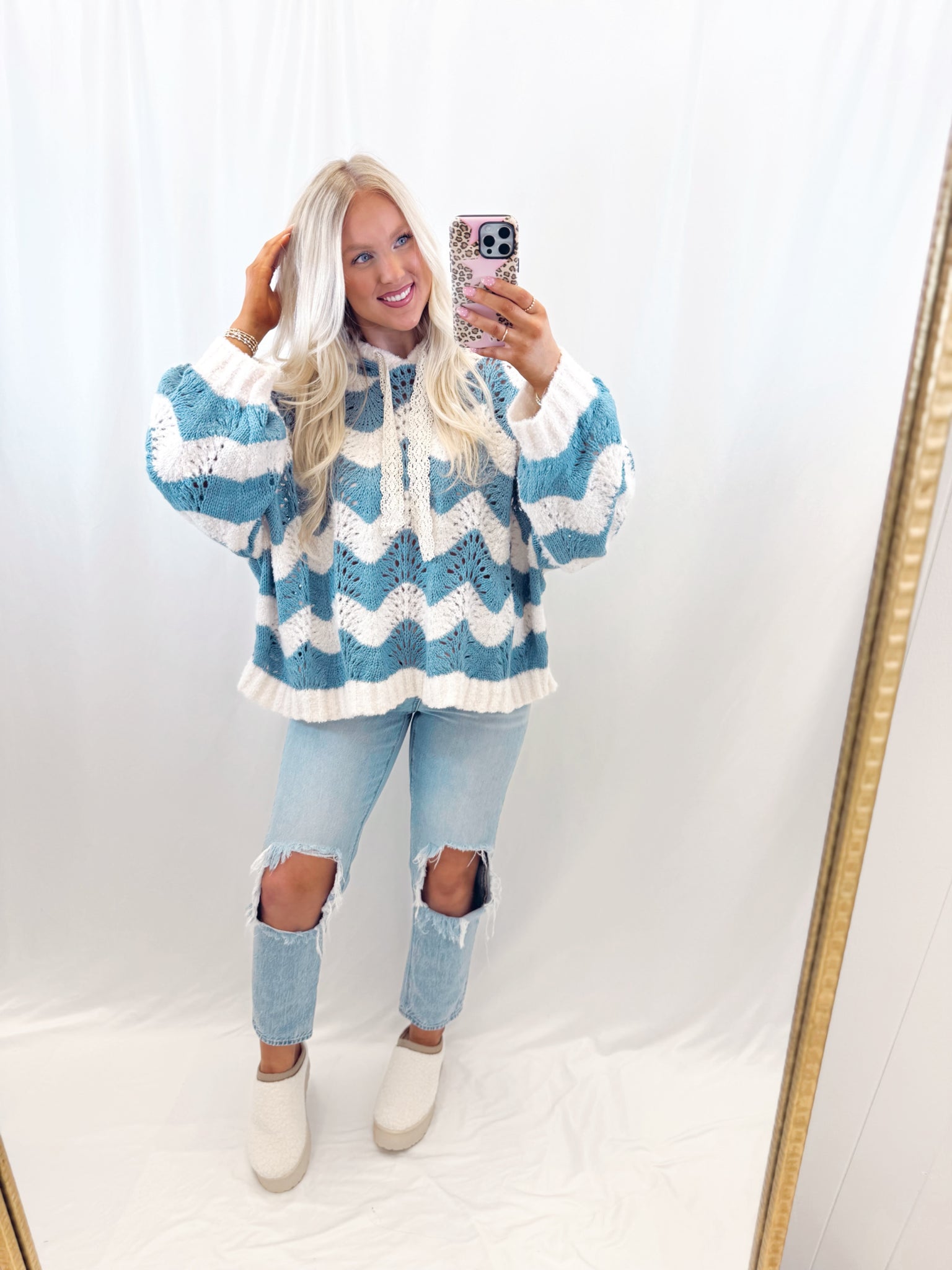 Sarah is 6 months pregnant, a US size 8/10 pictured in a large for an oversized/comfy fit. Meant to fit oversized. True size will still be oversized. Medium weight open knit style sweater. Hooded. Lace strings.