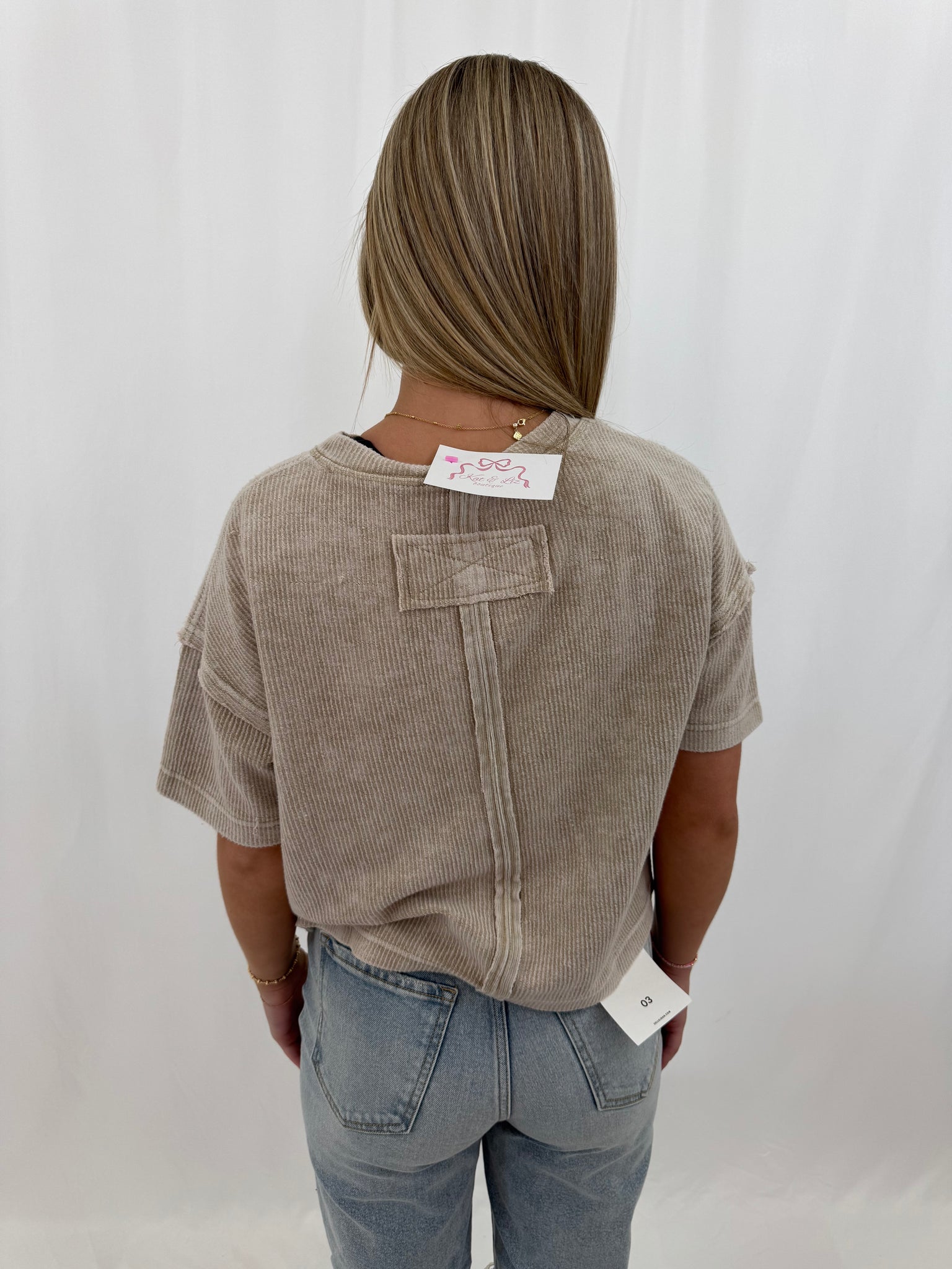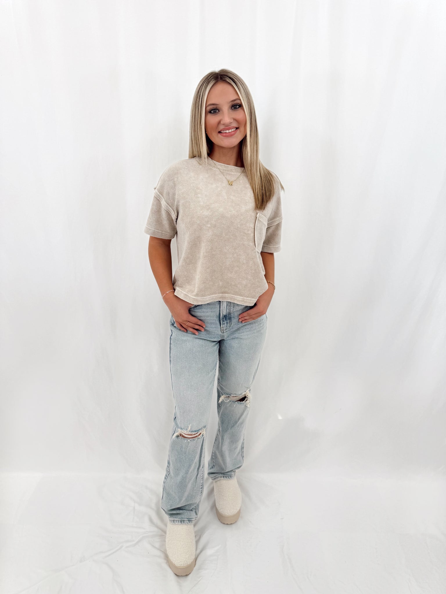 Megan is a true US size small, 3 in jeans, pictured in a size small. Washed ribbed short sleeve tees. Can be worn as is or layered.