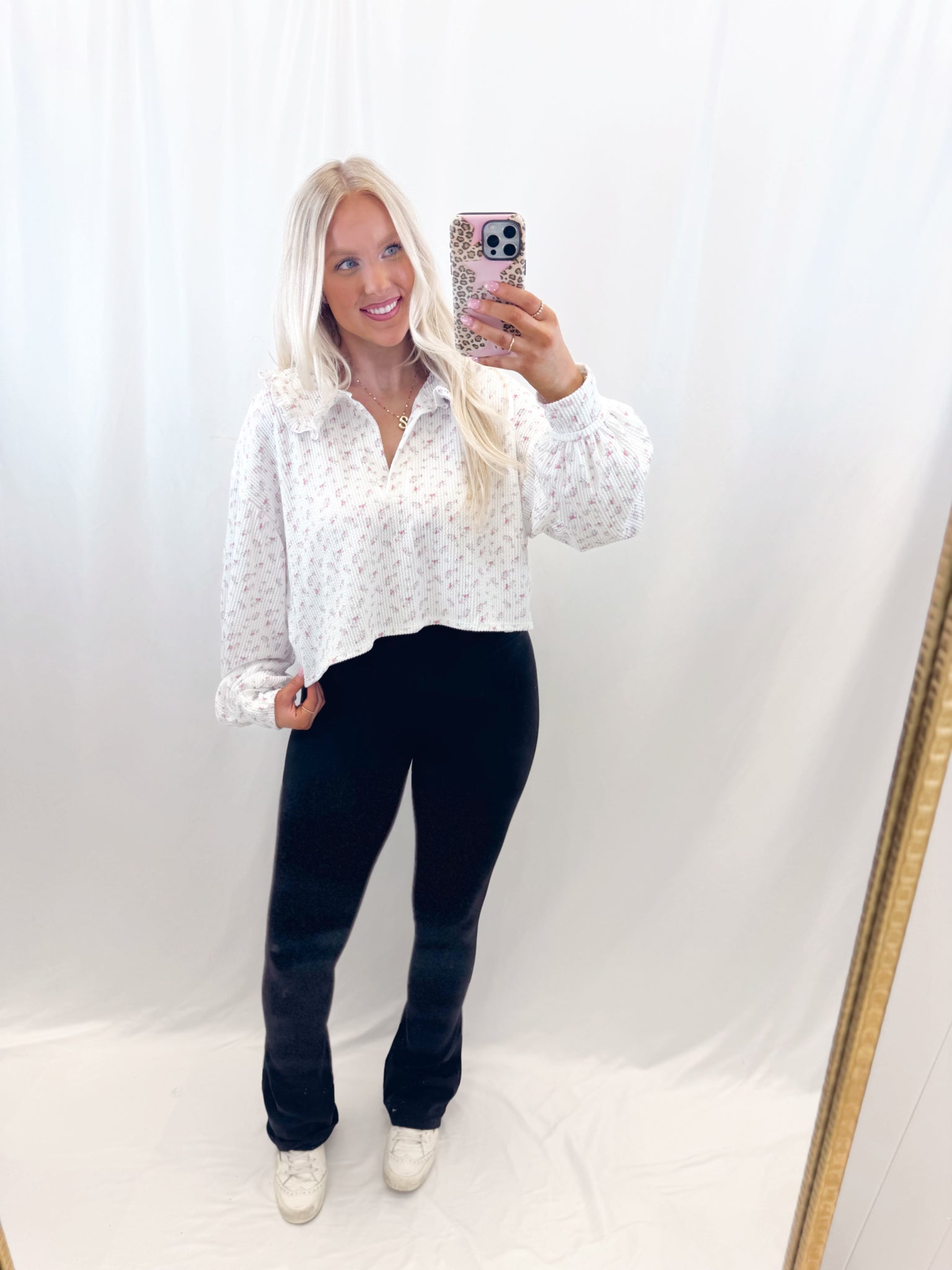 Sarah is 6 months pregnant, a US size 8/10 pictured in a large for an oversized/comfy fit. Waffled material. Ruffled peter pan collar. Cropped.