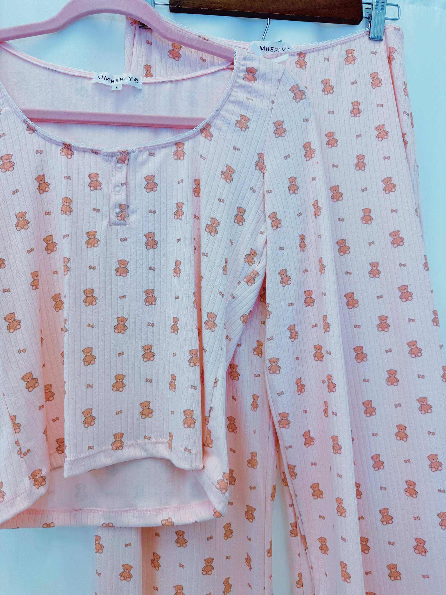 Stretchy pajamas with teddy bear print. Top and pants are sold together as a set