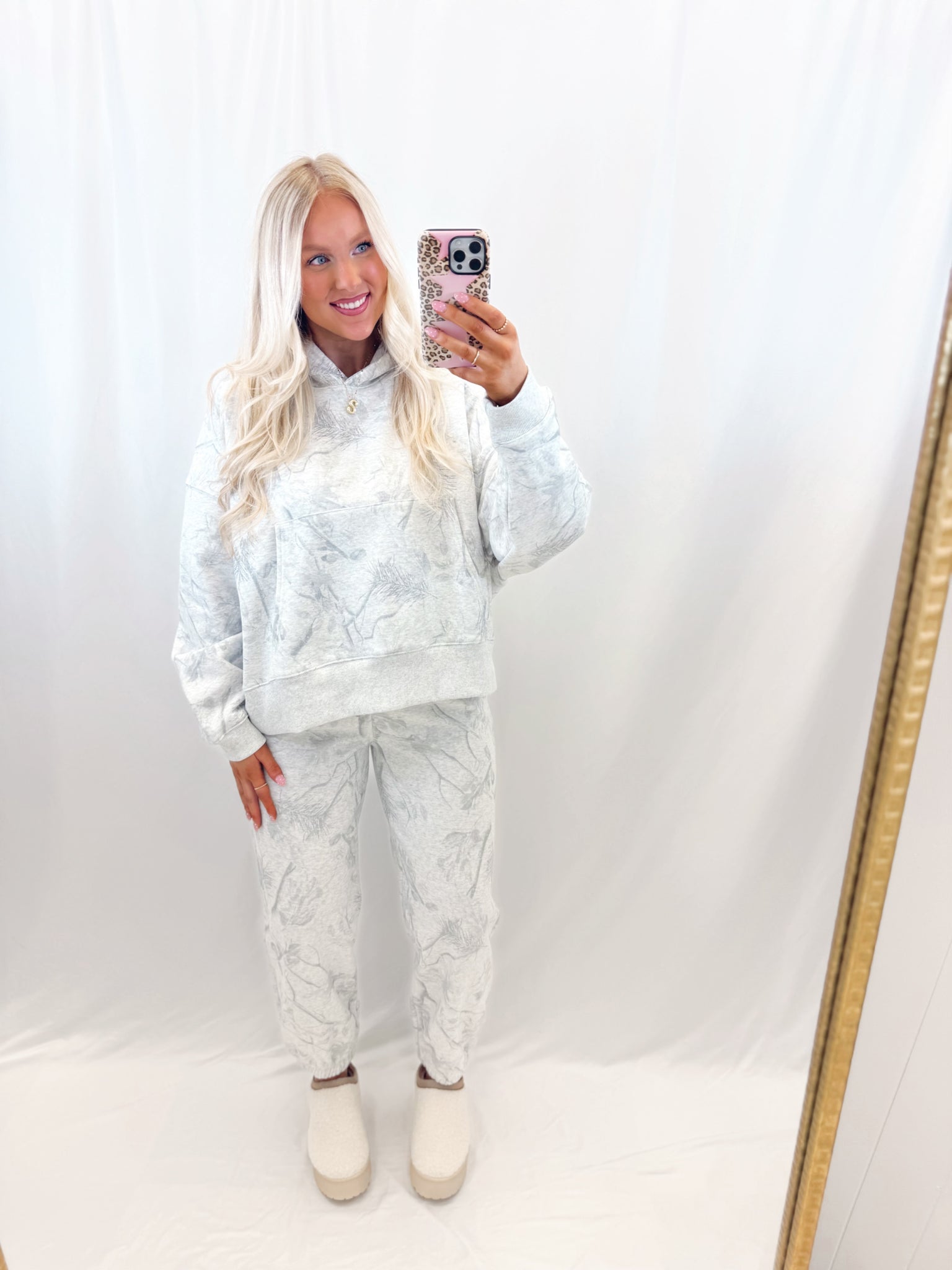 Sarah is 6 months pregnant, a US size 8/10 pictured in a large for an oversized/comfy fit.