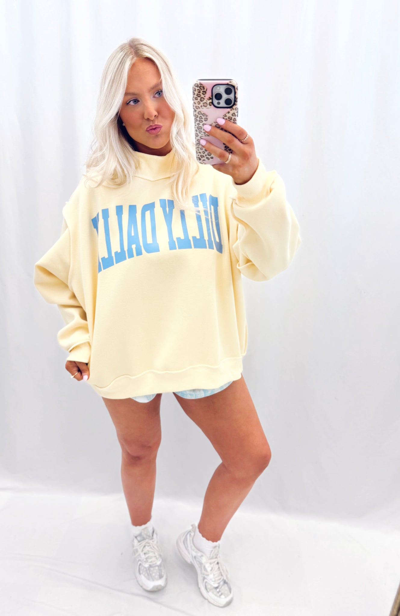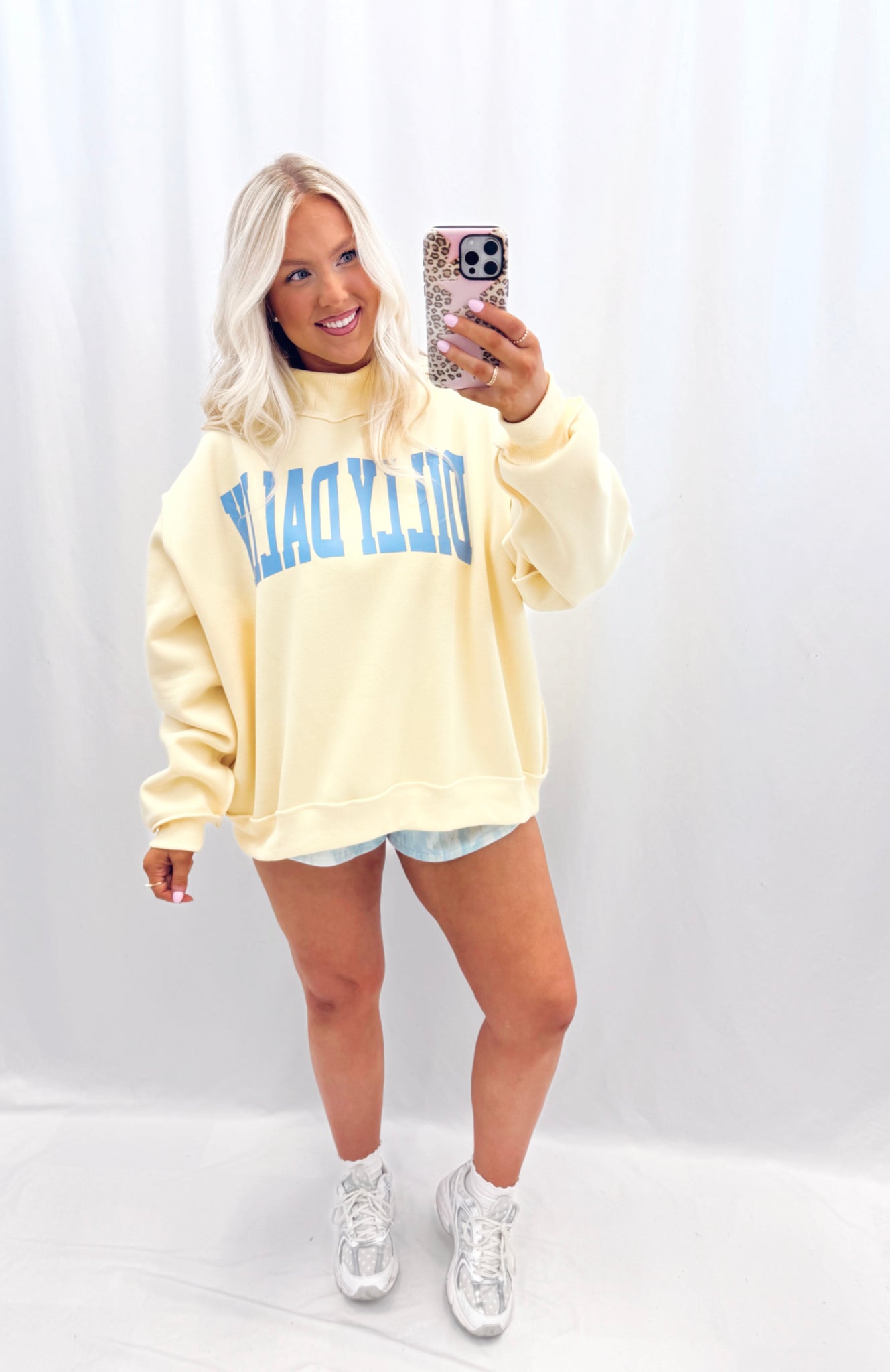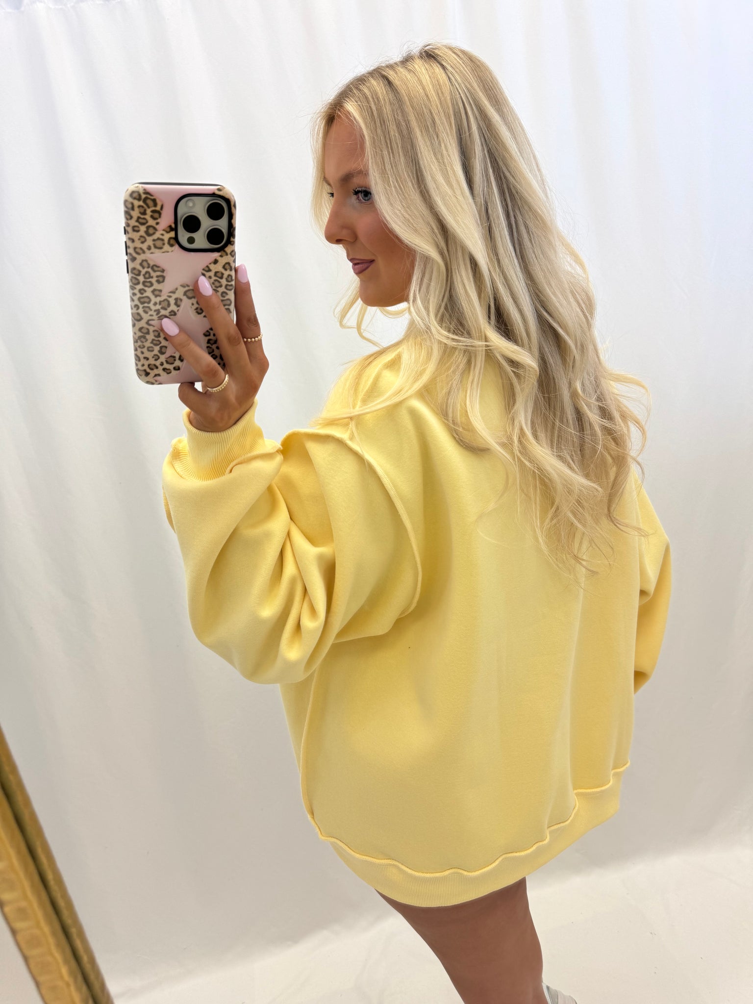 Sarah is currently a US size 10/12 in jeans and size large in tops pictured in a size L/XL. Oversized