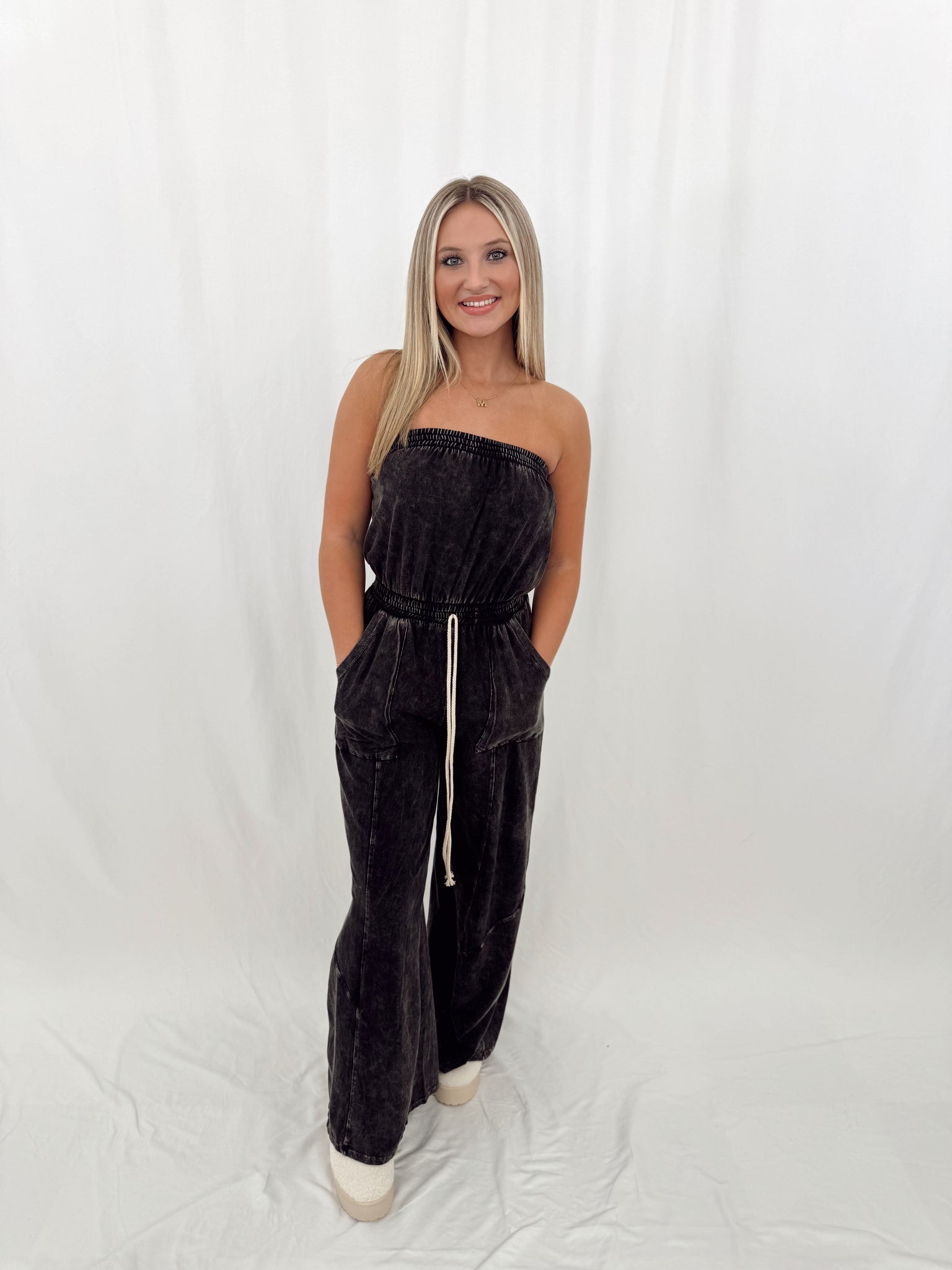 Megan is a true US size small, 3 in jeans, pictured in a size small. Strapless jumpsuit. Wide leg. Stretchy waist and bust bands. Has pockets. Super soft.