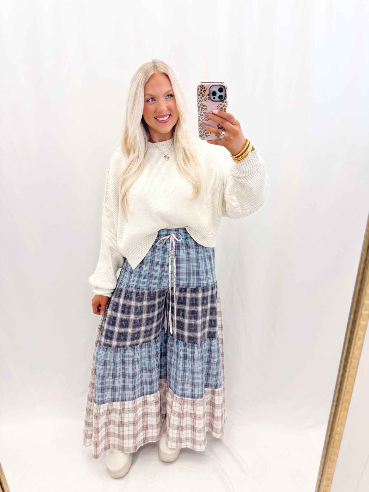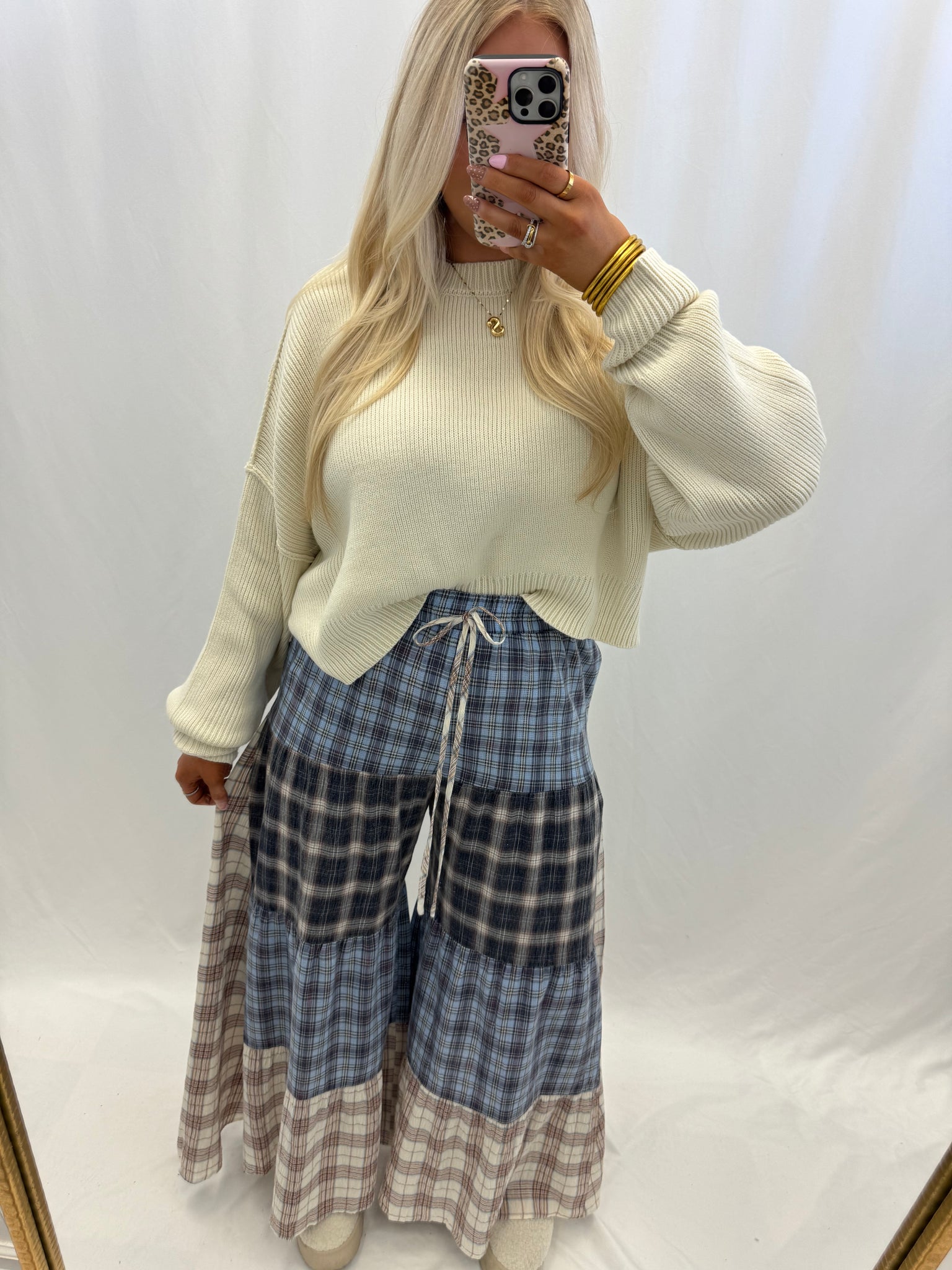Plaid colorblocking wide leg tiered pants. Stretchy waistband and pockets. Paired with our MEET YOU AT THE CAFE SWEATER.