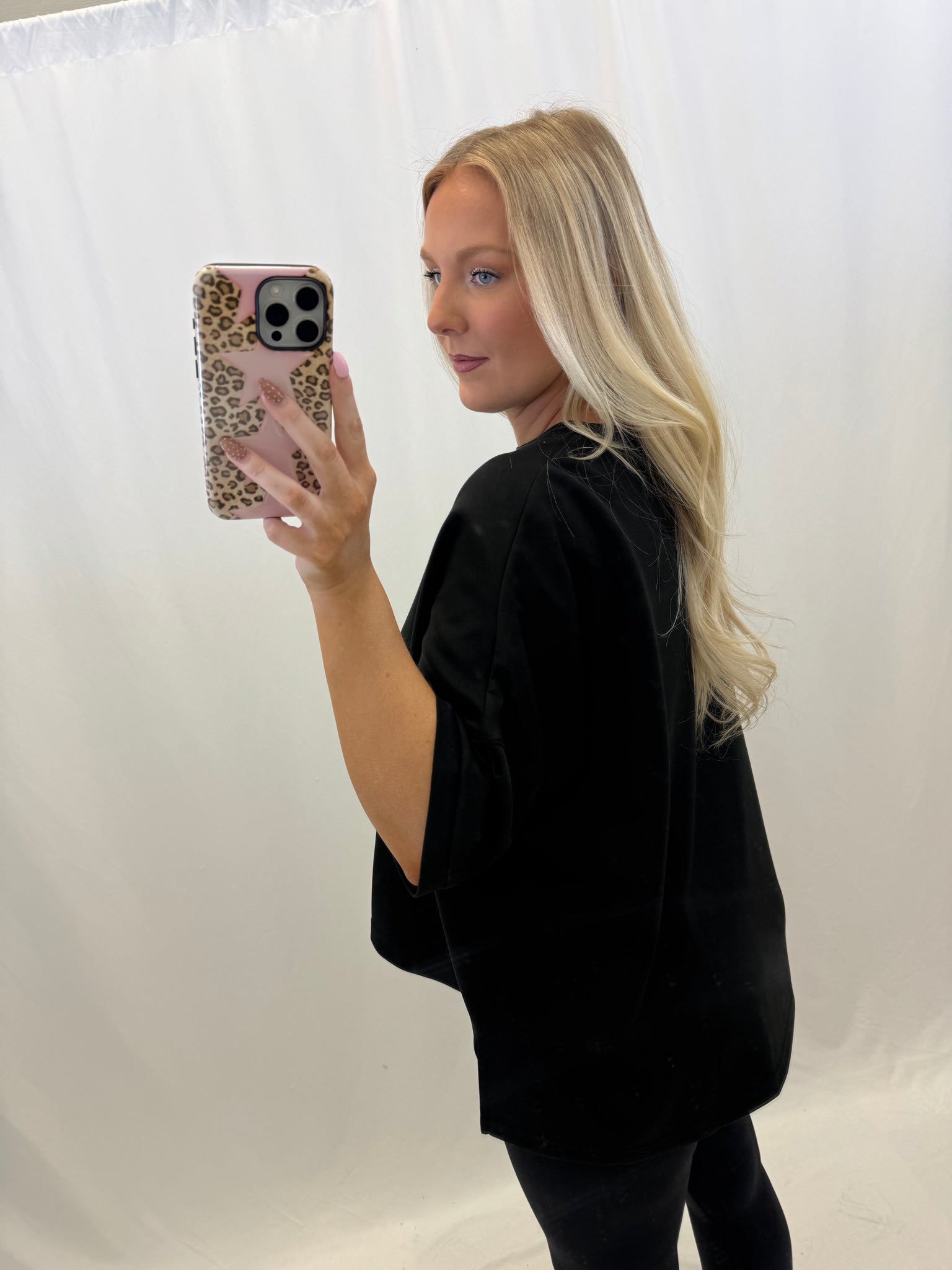 Sarah is 5'6 (7 mo pregnant) currently a size large in tops, a size 10/12 in jeans wearing a size L/XL. Meant to fit oversized.