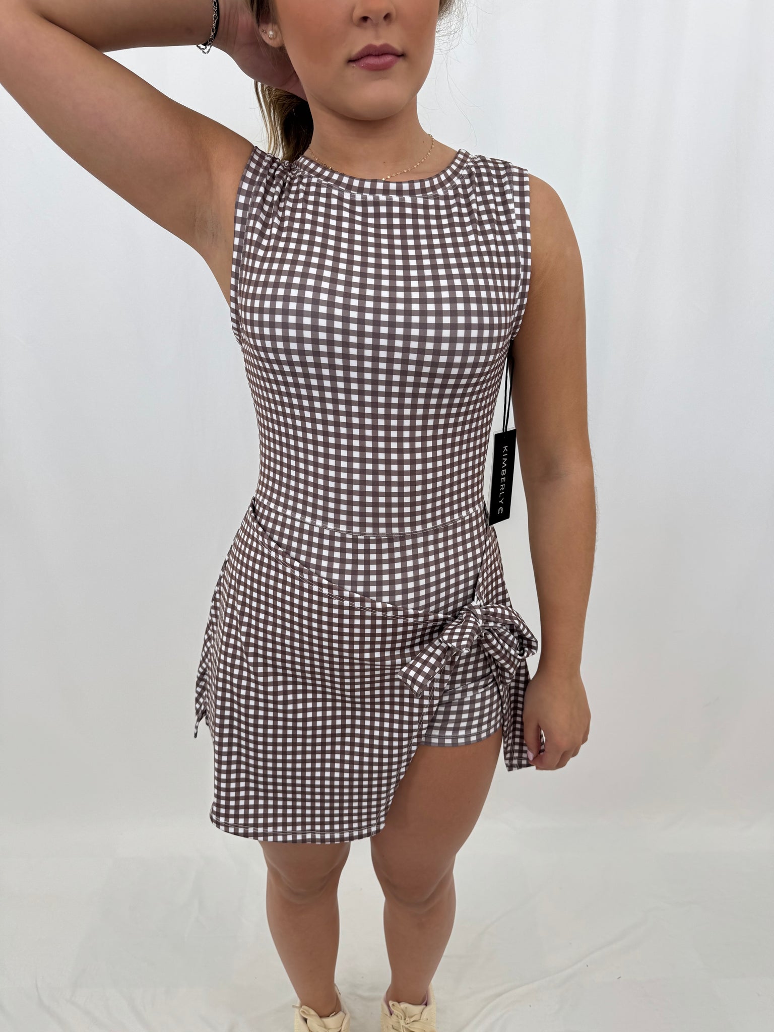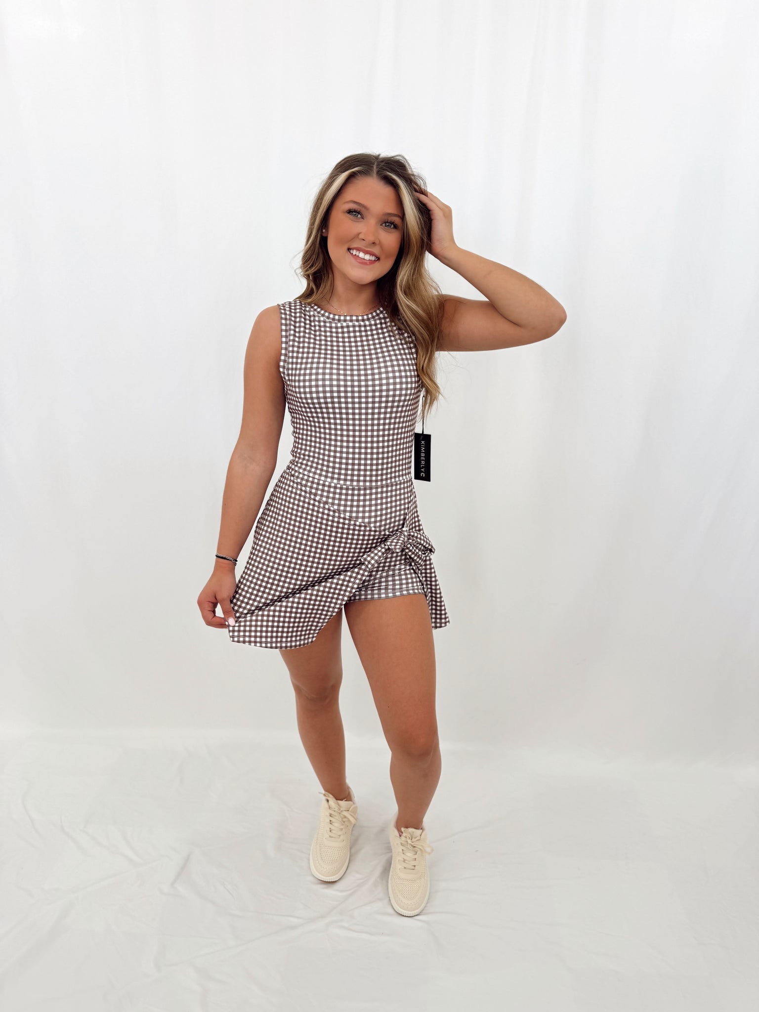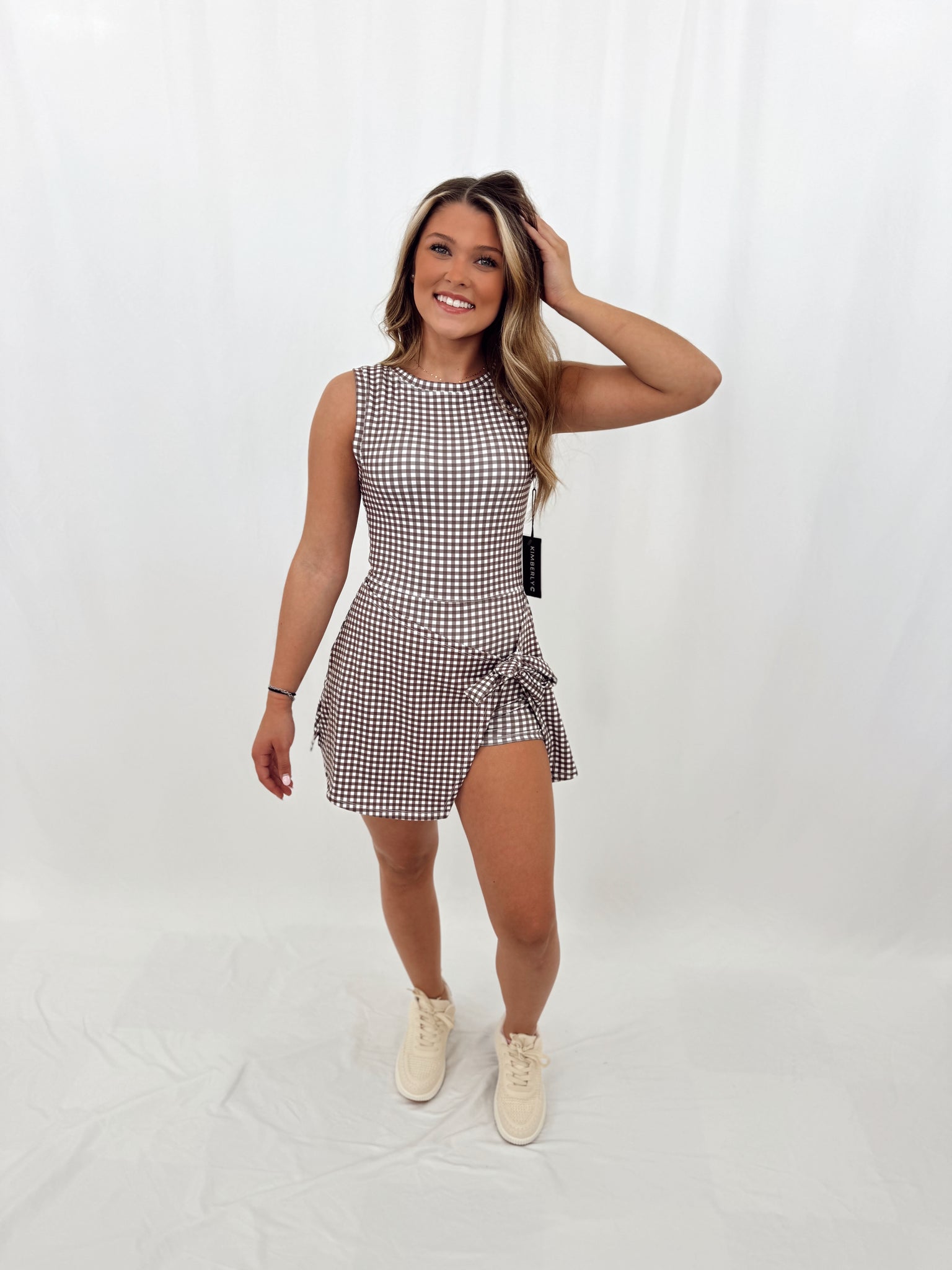 Anna is a true US size small, 3 in jeans, pictured in a size medium. Romper with wrap tie skirt. Athletic