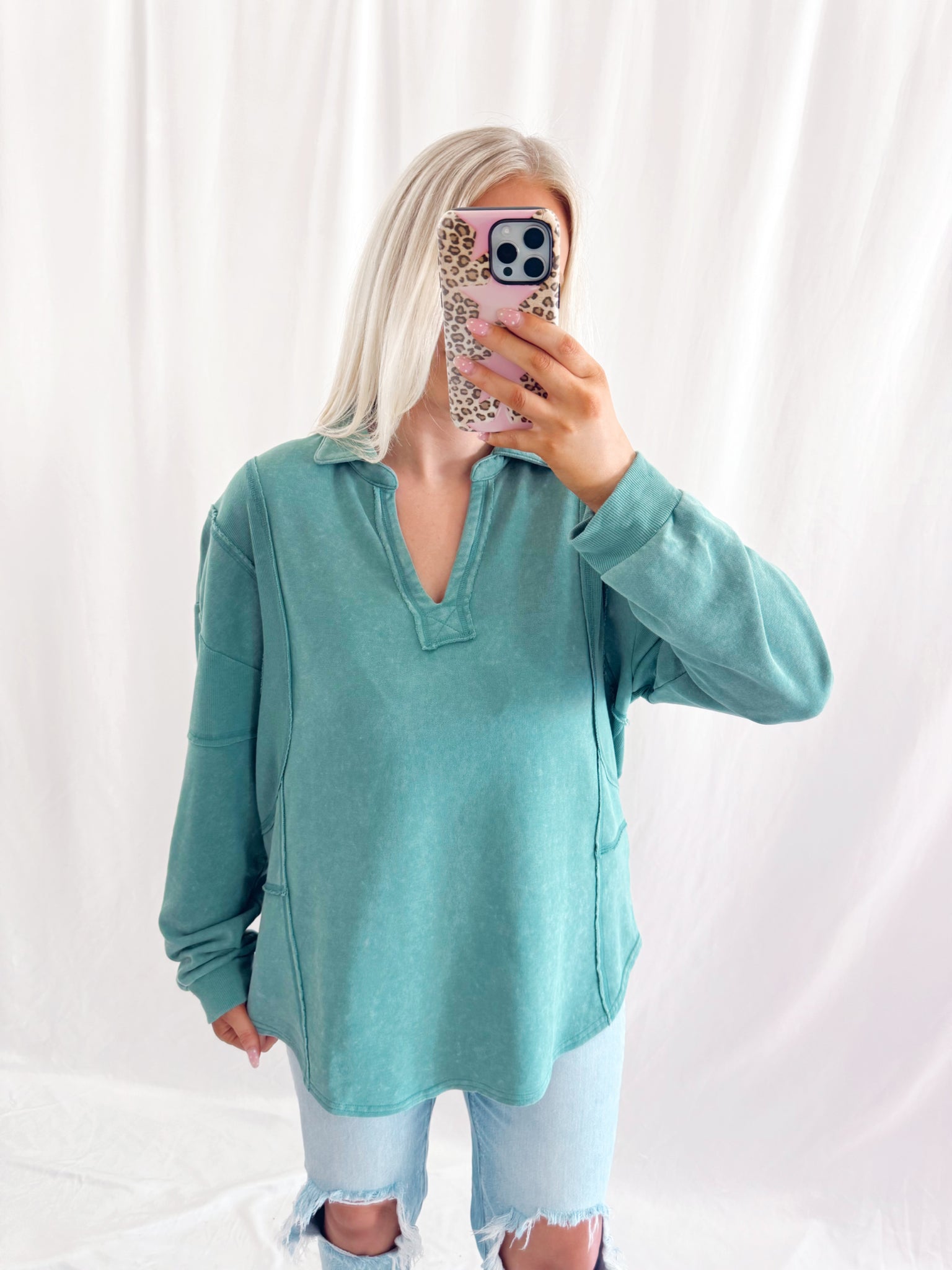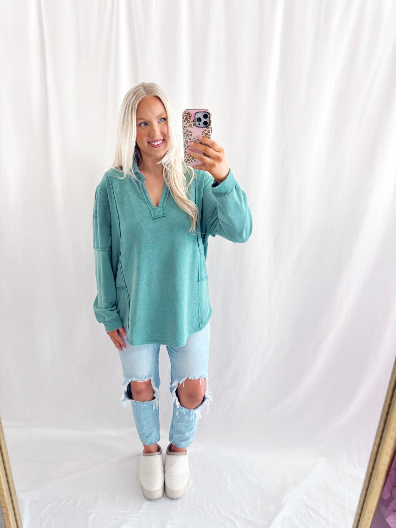 Sarah is 6 months pregnant, a US size 8/10 pictured in a large for an oversized/comfy fit.