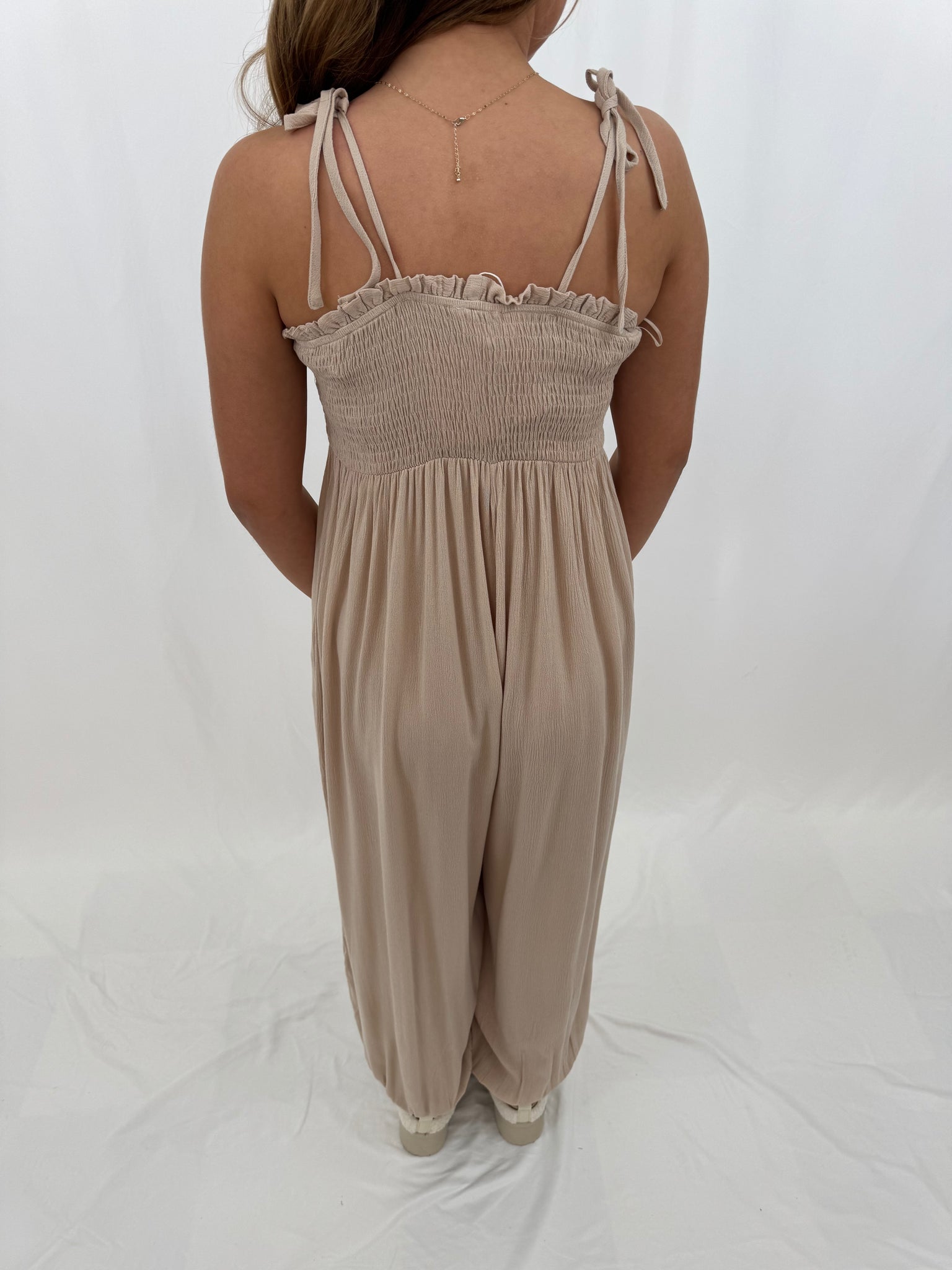 Anna is a true US size small, 3 in jeans, pictured in a size small. Jumpsuit. Stretchy smocked bust. Flowy bodice. Tie straps. Balloon/jogger legs with stretchy ankle hem.