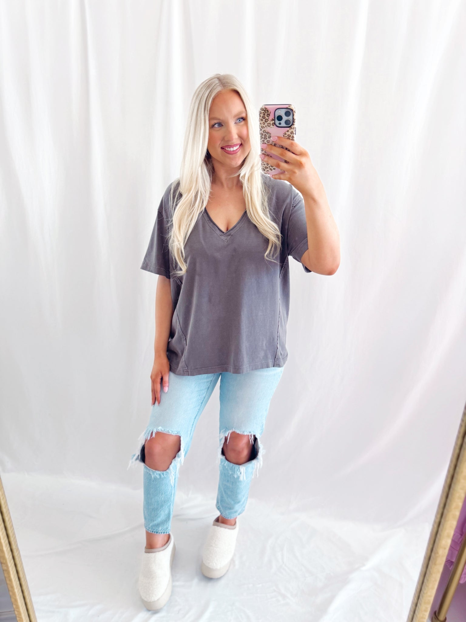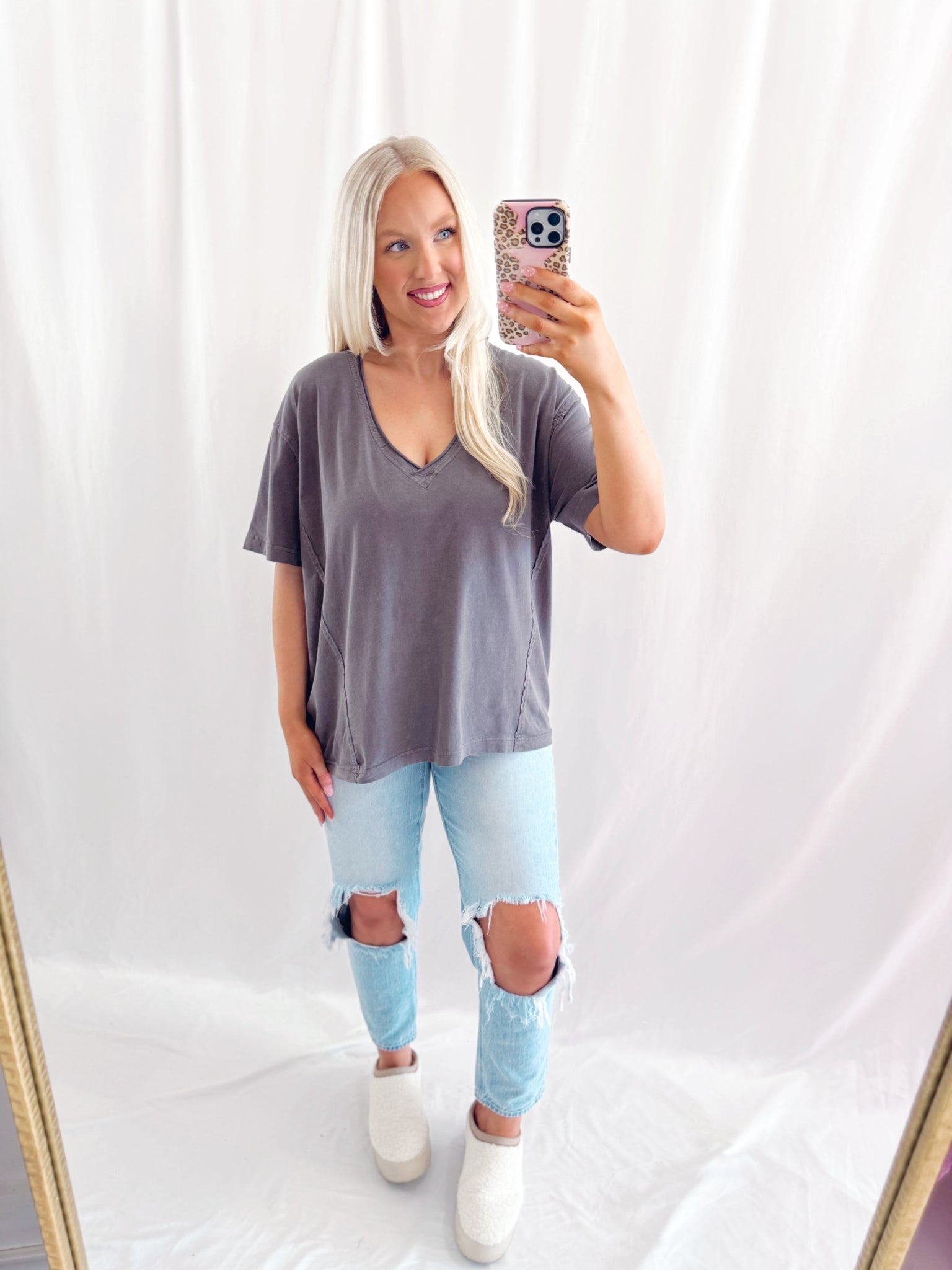 Sarah is 6 months pregnant, a US size 8/10 pictured in a large for an oversized/comfy fit.
