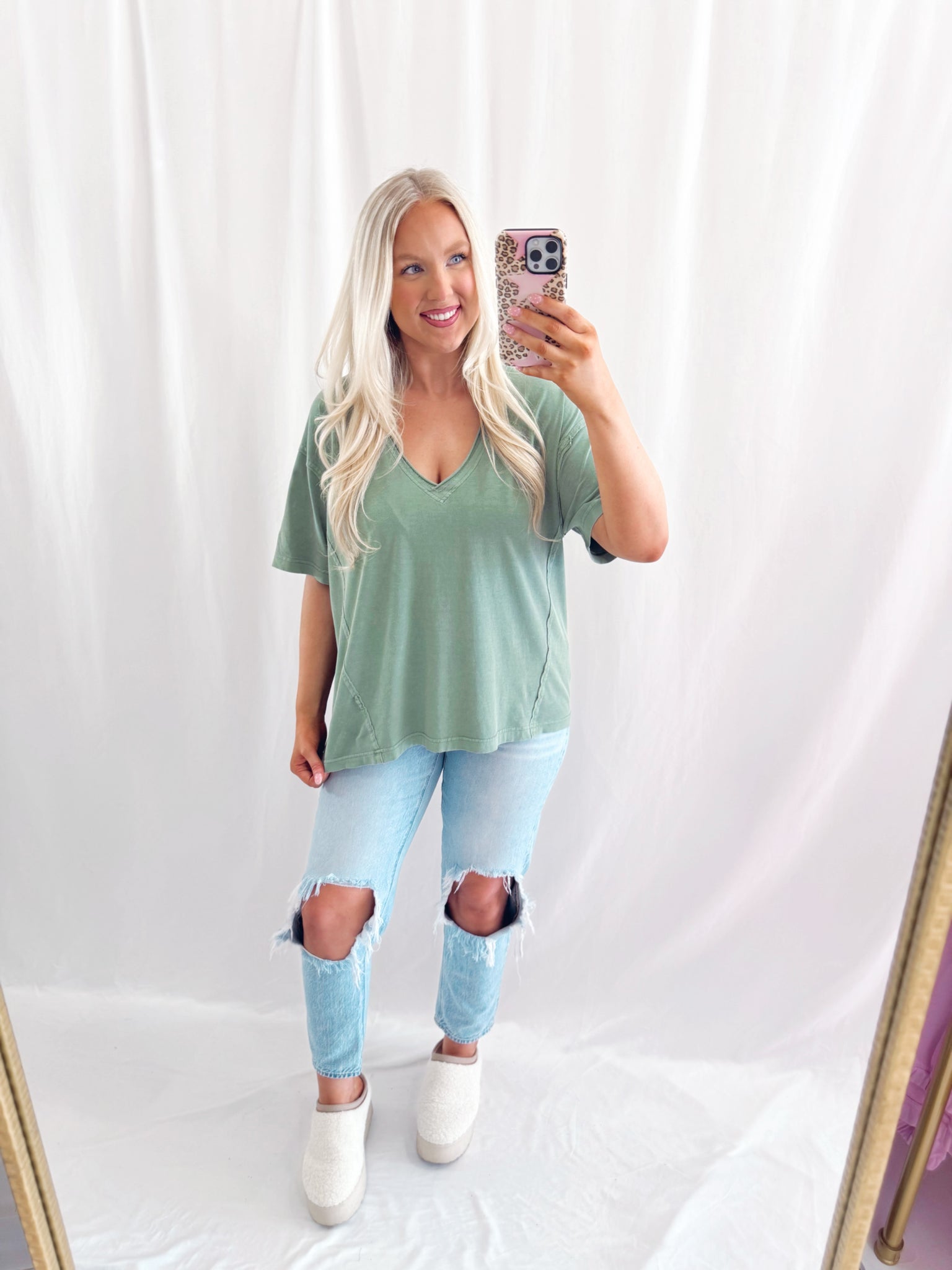 Sarah is 6 months pregnant, a US size 8/10 pictured in a large for an oversized/comfy fit.