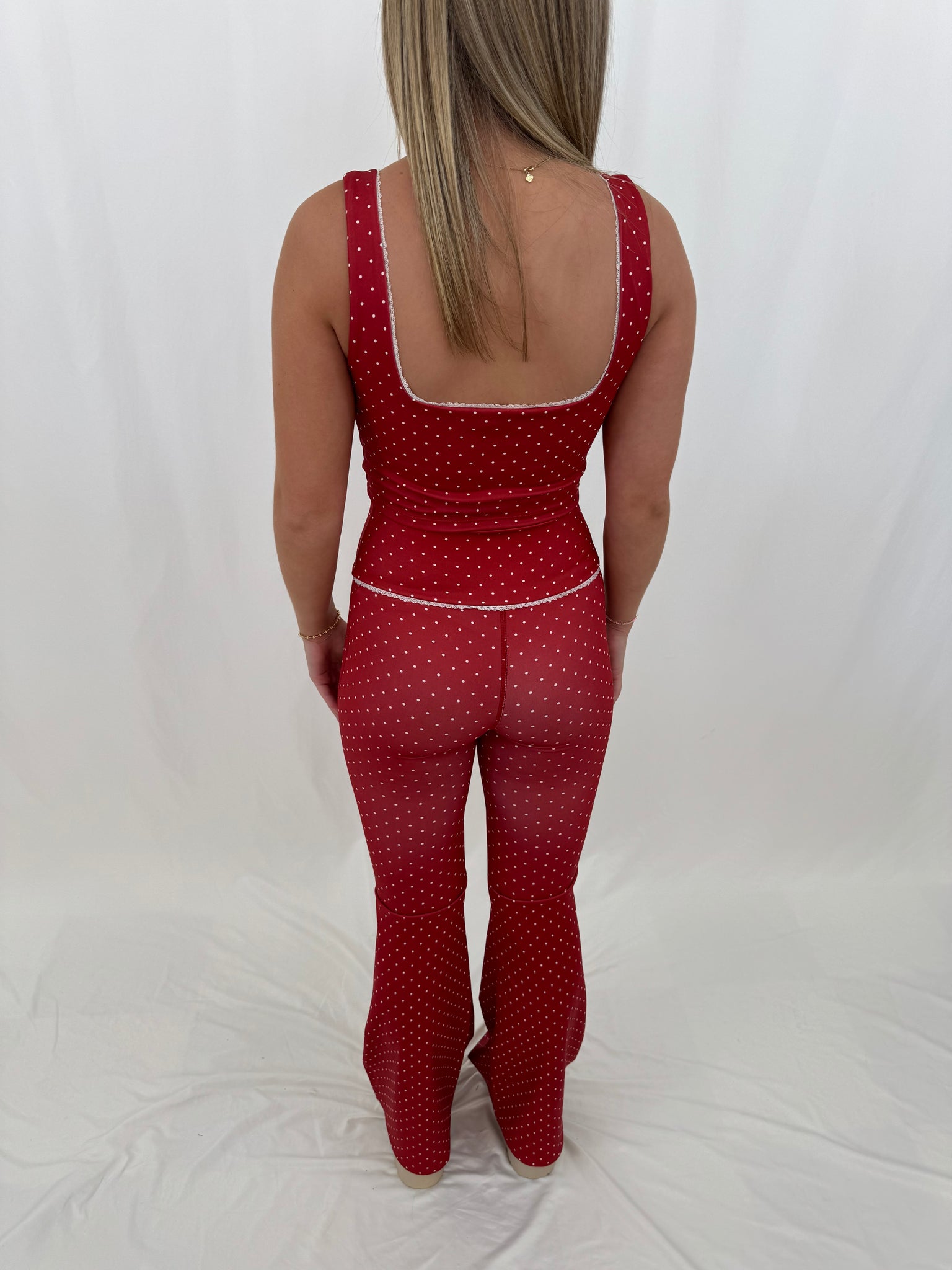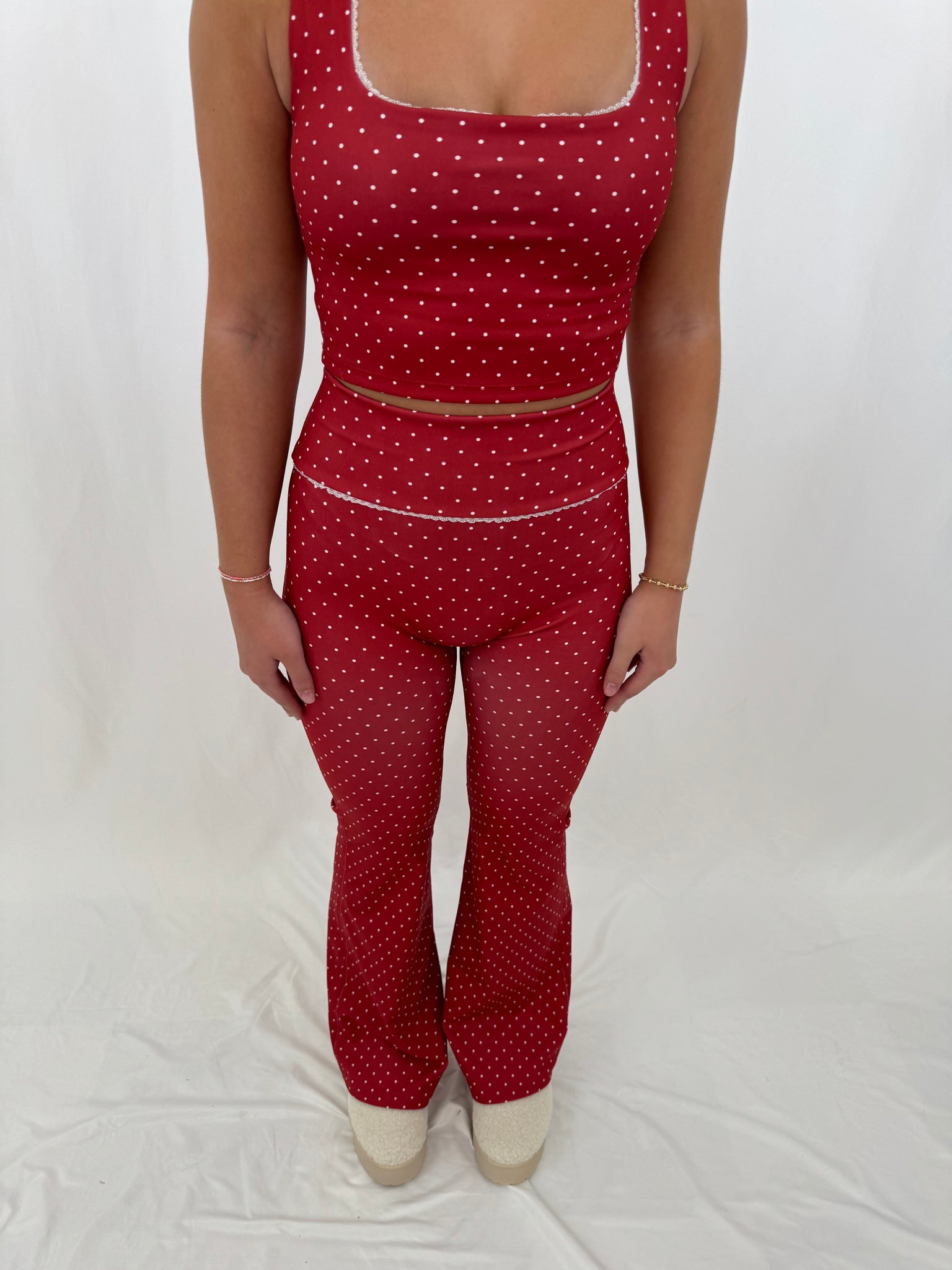 Megan is a true US size small, 3 in jeans, pictured in a size small. Athletic tank with built in bra, athletic flare leggings. Polka dot print.
