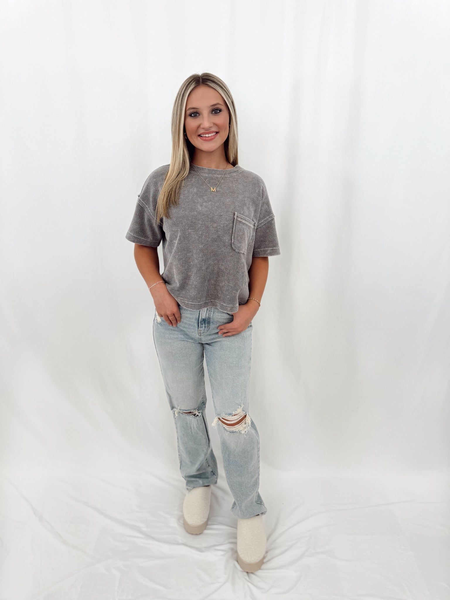 Megan is a true US size small, 3 in jeans, pictured in a size small. Washed ribbed short sleeve tees. Can be worn as is or layered.