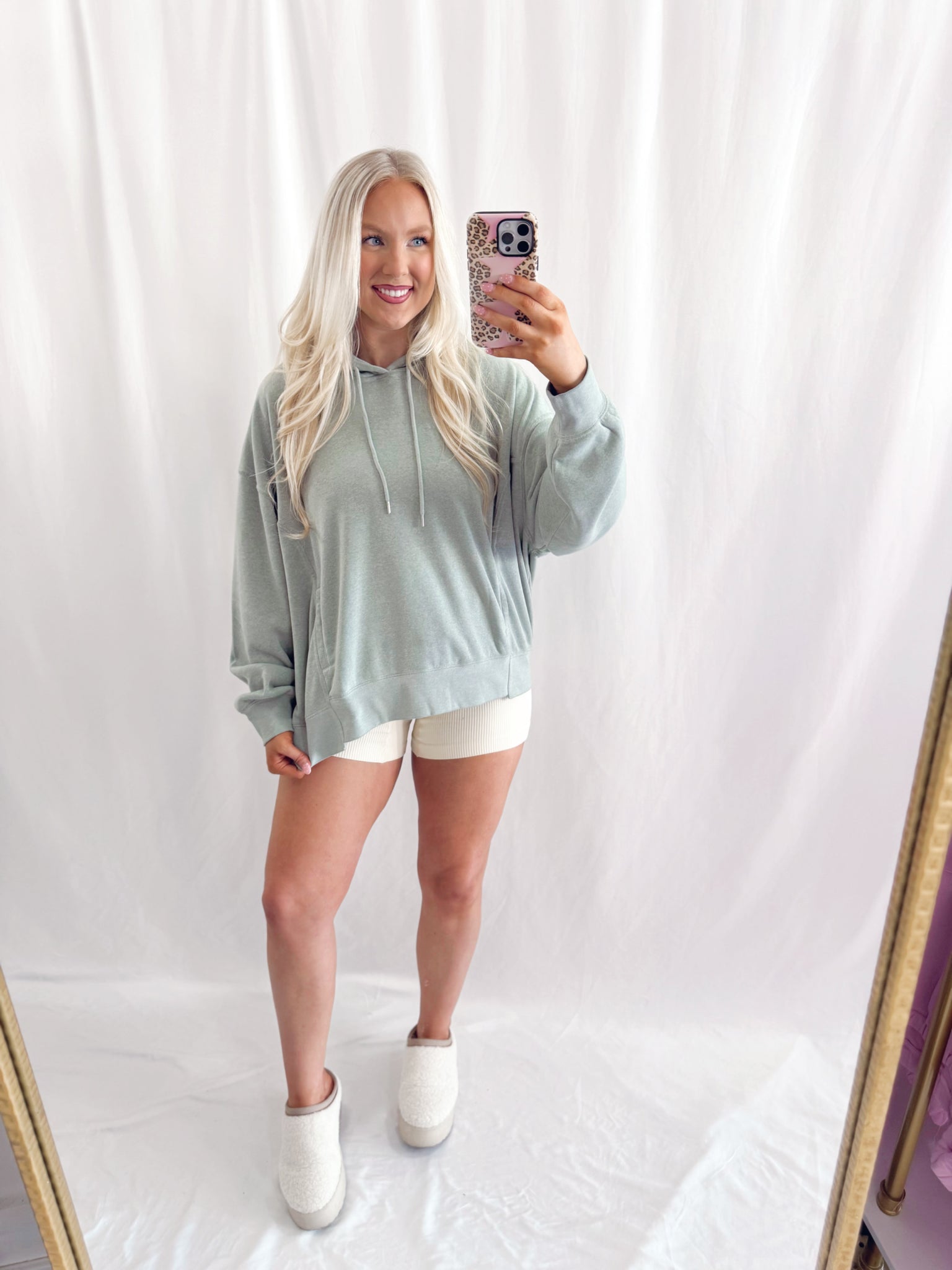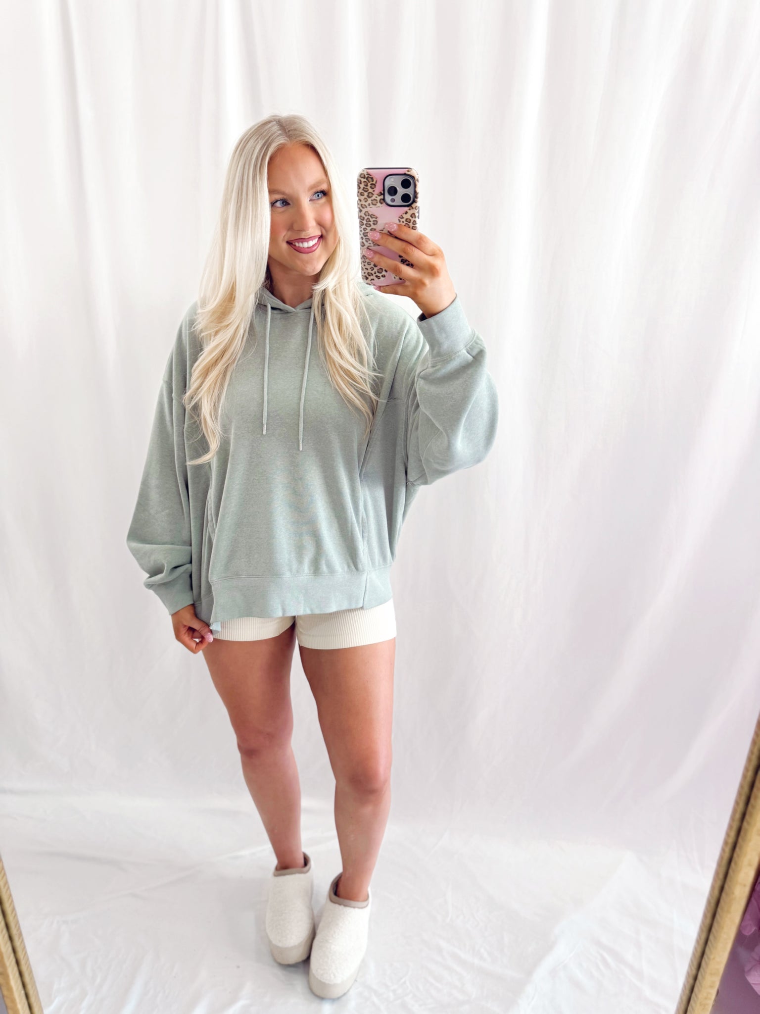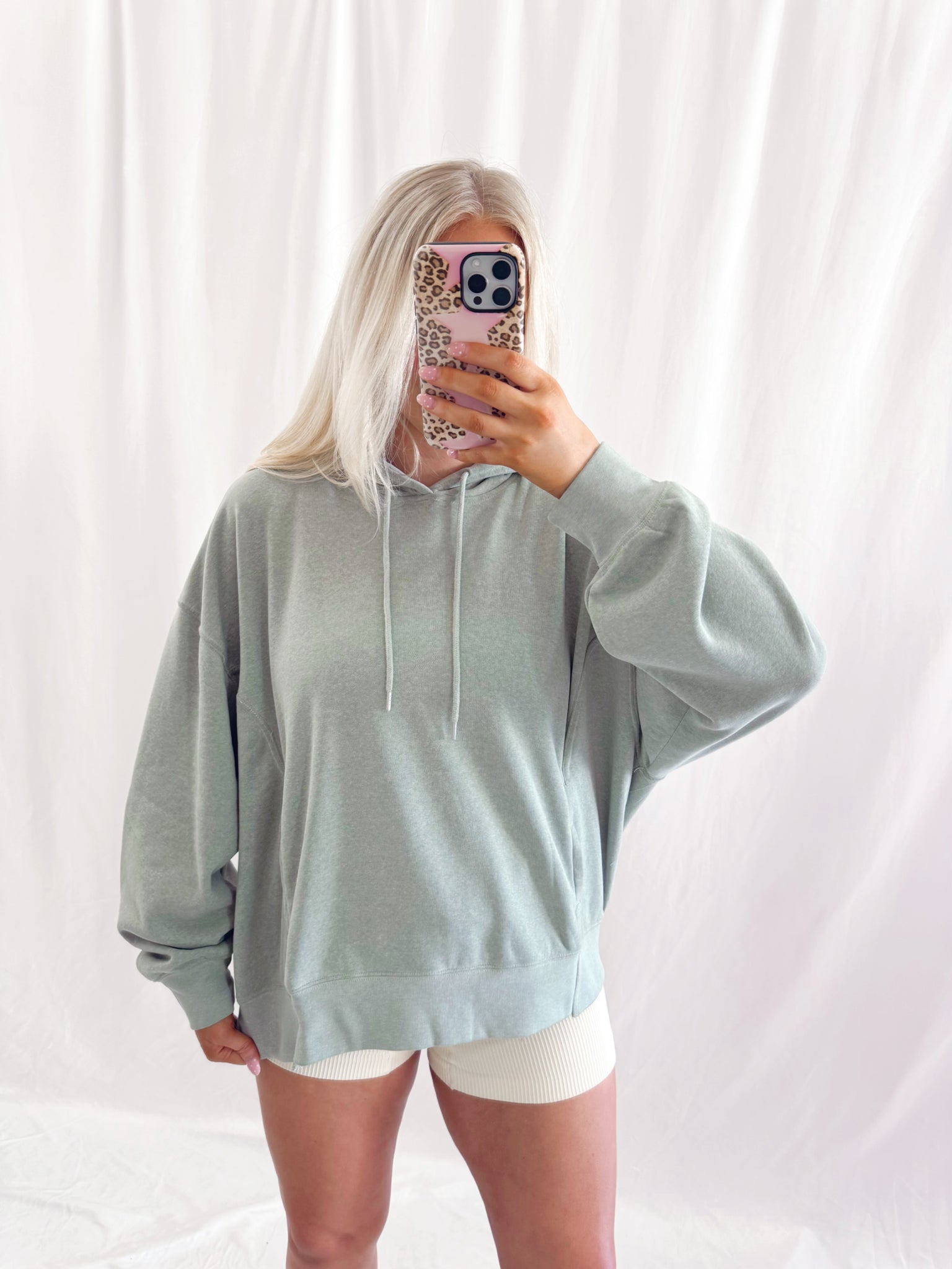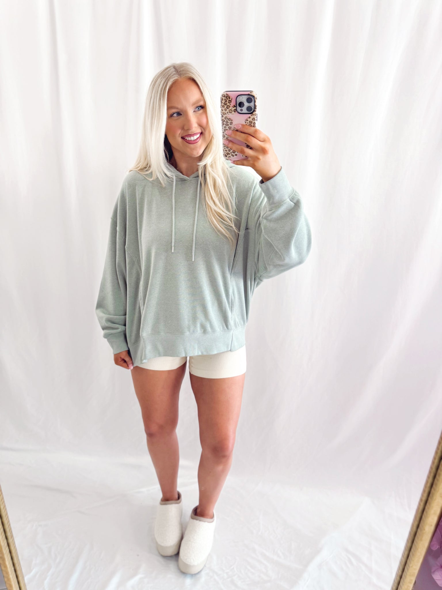Sarah is 6 months pregnant, a US size 8/10 pictured in a large for an oversized/comfy fit.