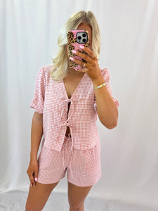 Sarah is a US size 4/27 in jeans, normally wears a medium in tops pictured in a medium. Top and shorts sold together. Sarahs measurements: